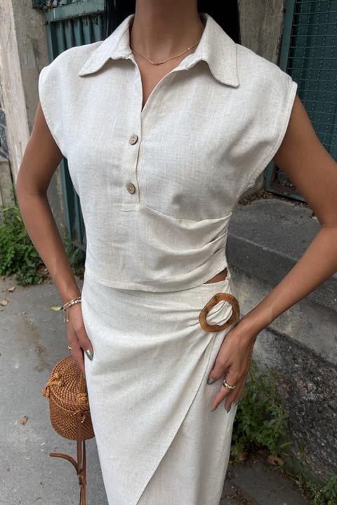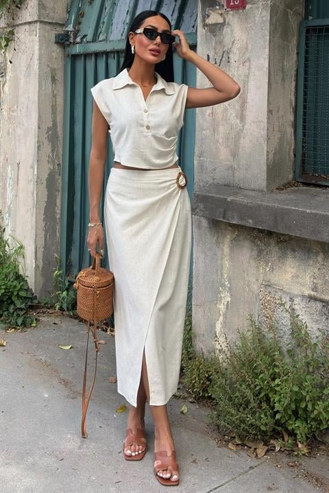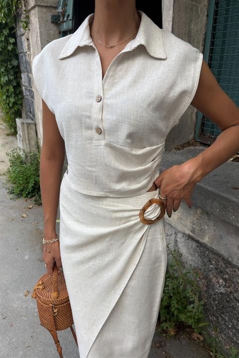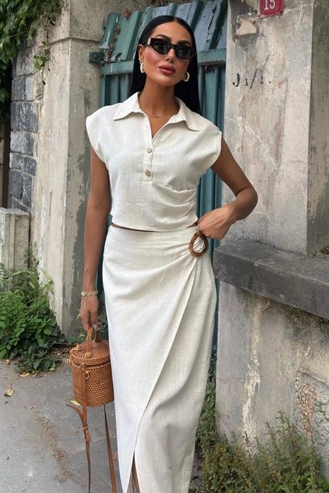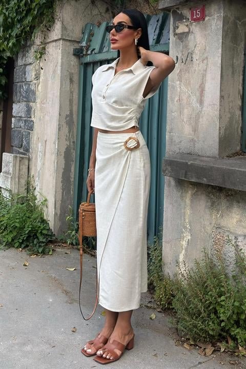Bluzu Büzgülü Ve Eteği Tokalı Keten Takım 10204