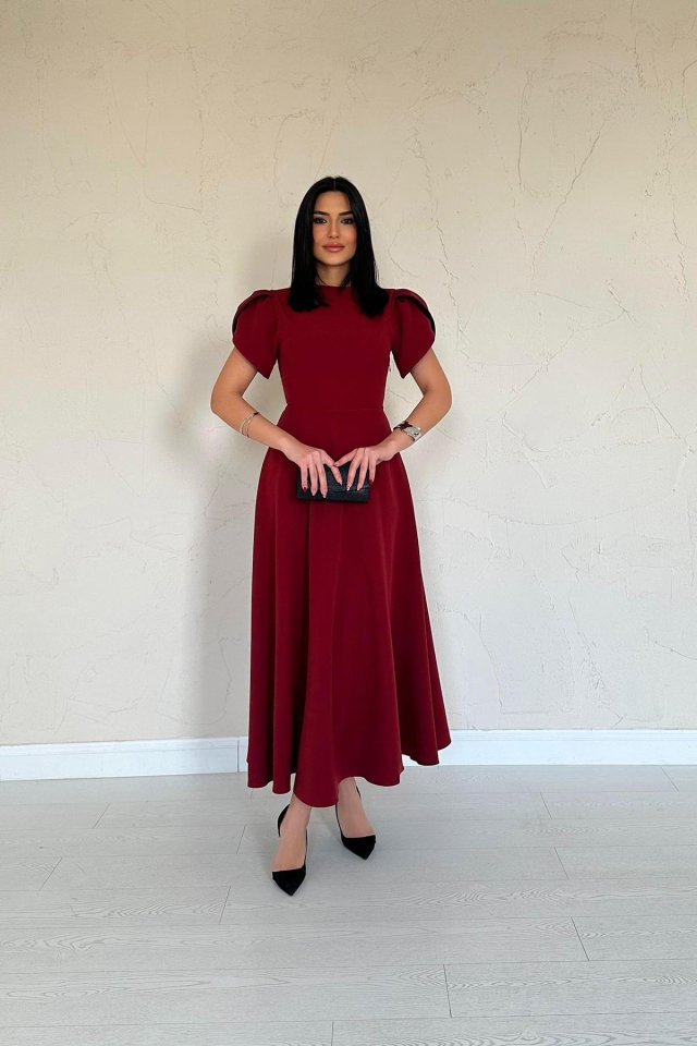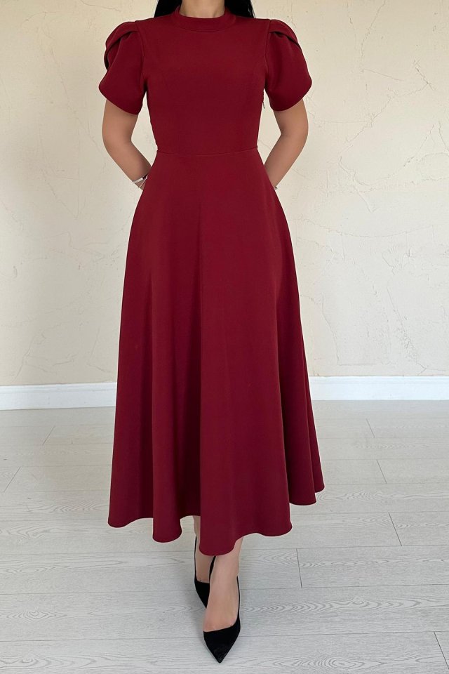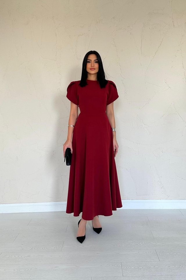 Bordo Arkası Fiyonk Garnili Britli Elbise
