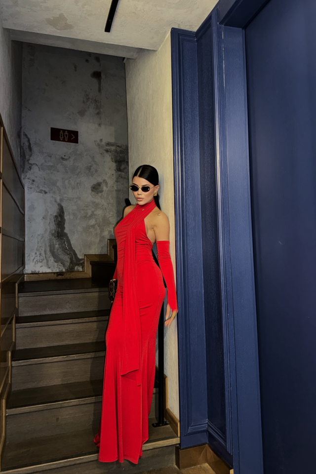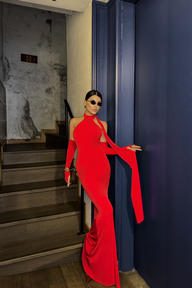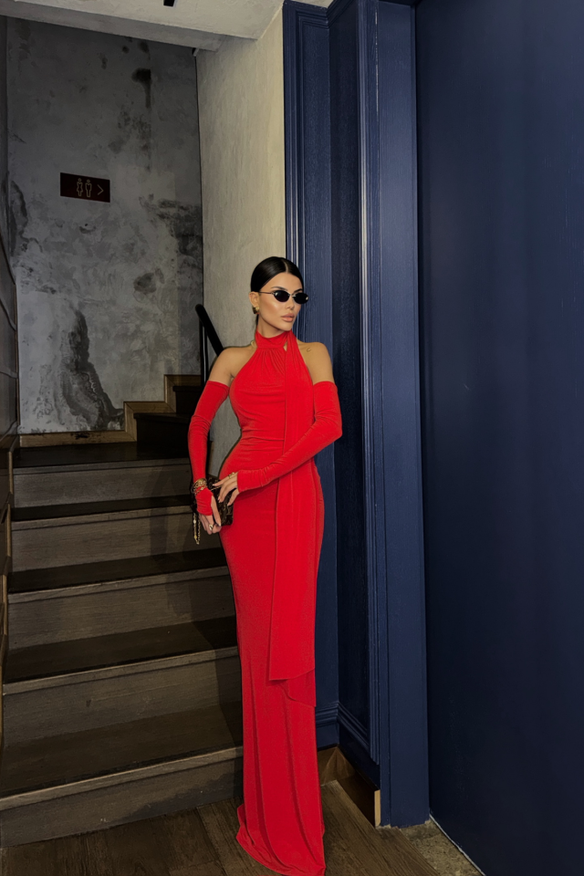 BOYUNDANBAĞLAMA DETAYLI ELDİVEN KOL SANDY ELBİSE – Kırmızı