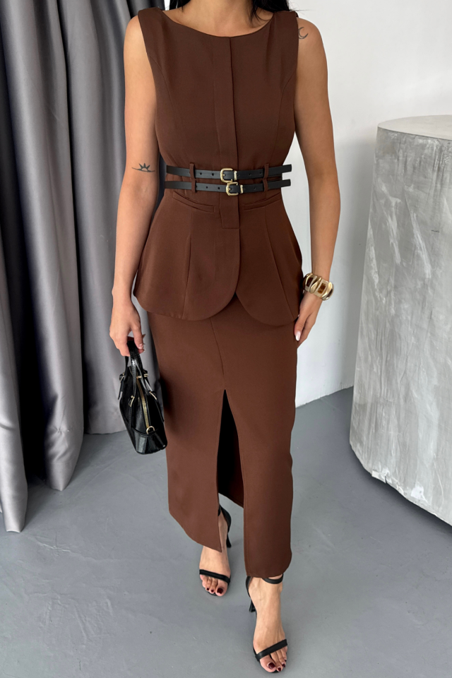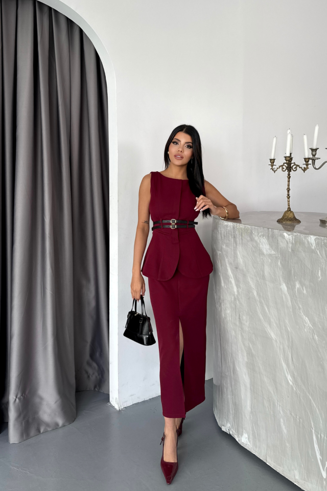 CEKET-ETEK GÖRÜNÜMLÜ ELBİSEÇİFT KEMER DETAYLI – Bordo