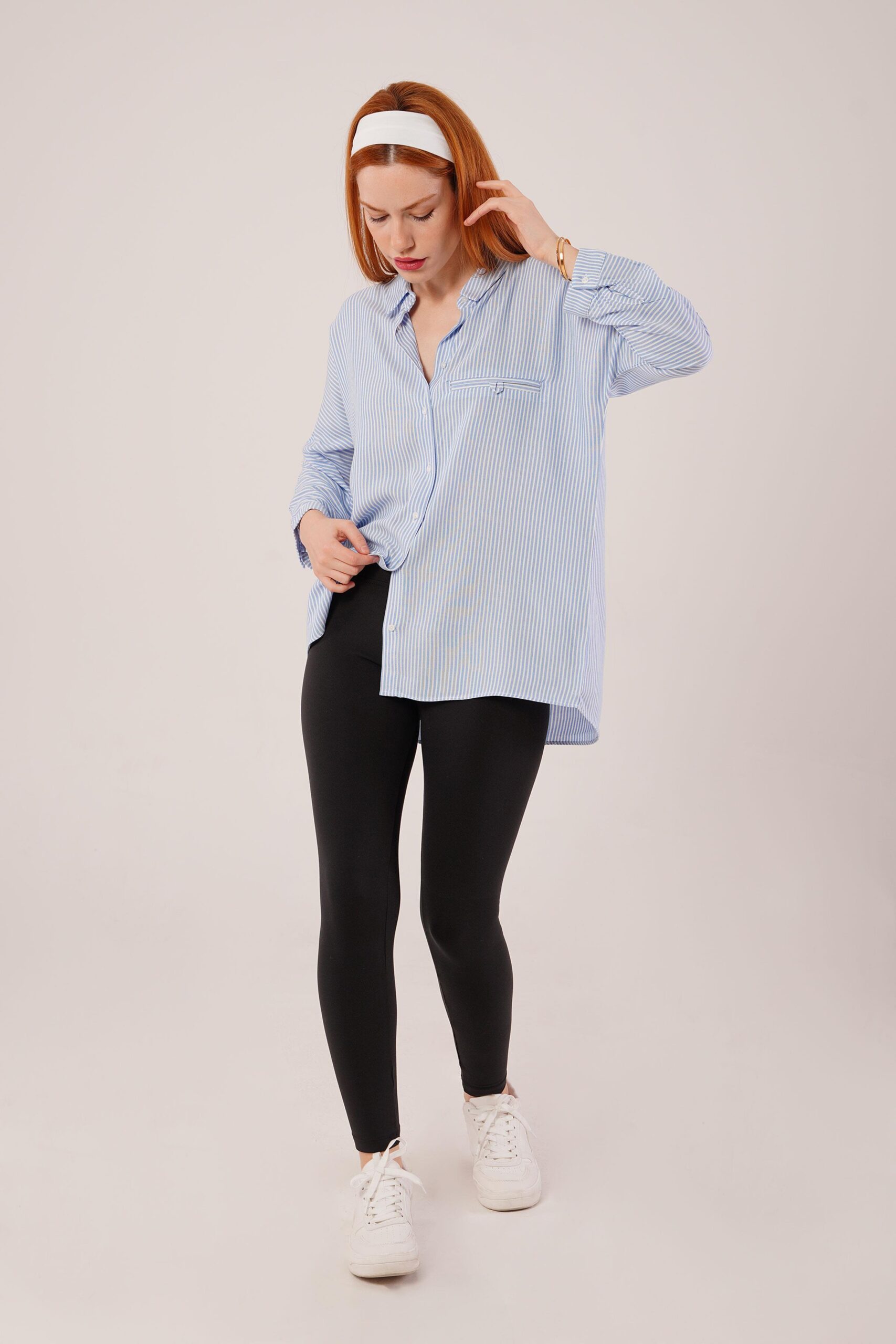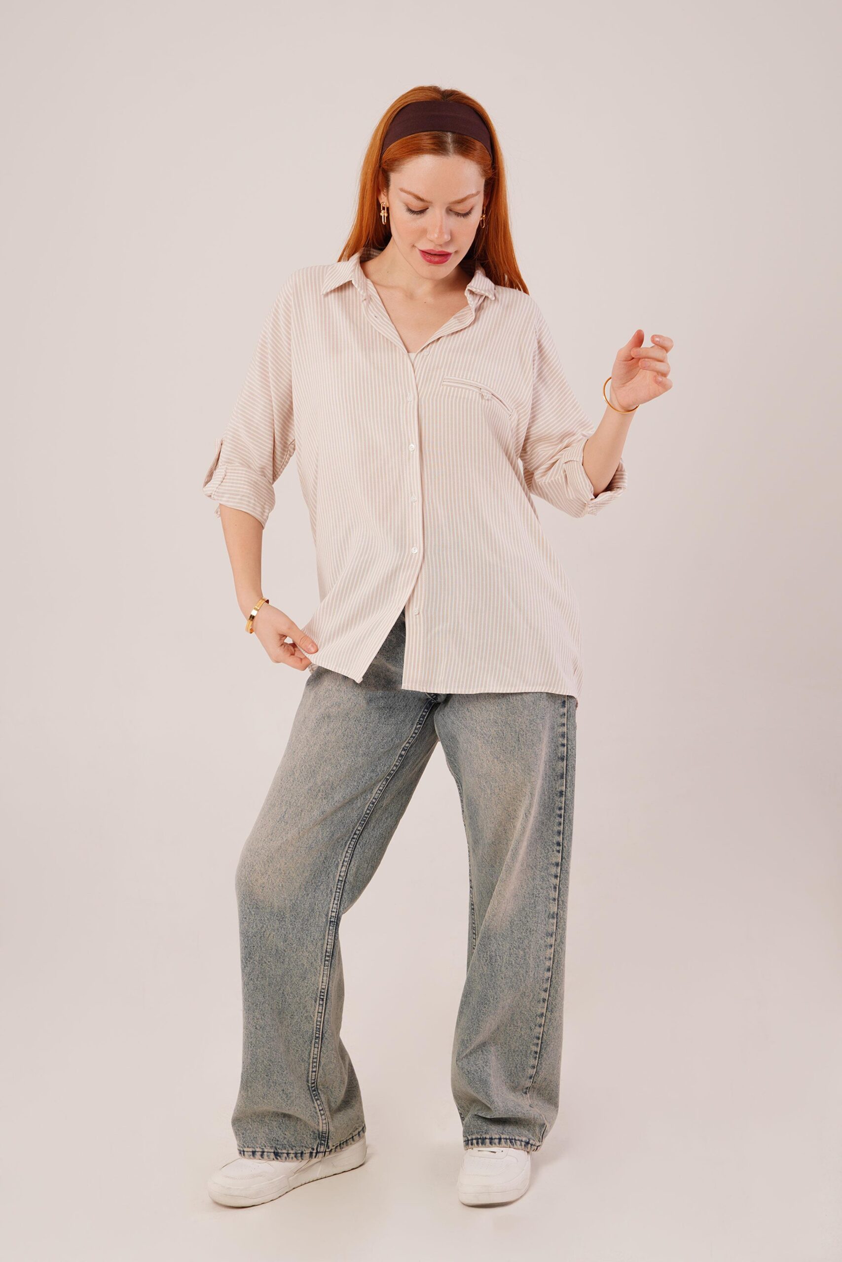 Cep Detay Çizgili Oversize Pembe Gömlek