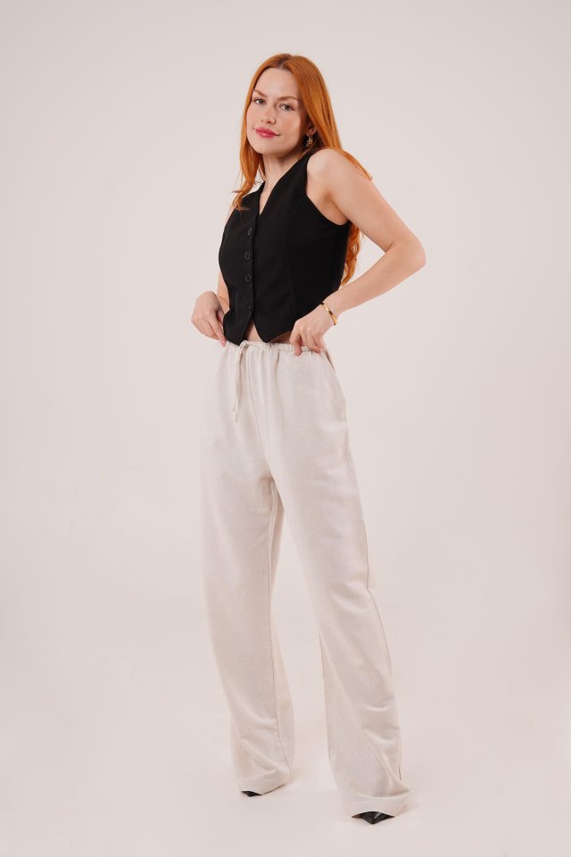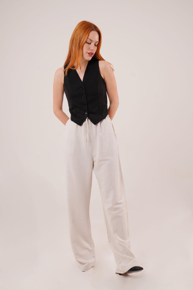 Cepli Bağlama Detaylı Keten Ekru Pantolon