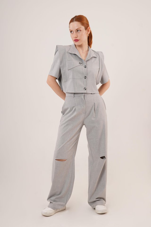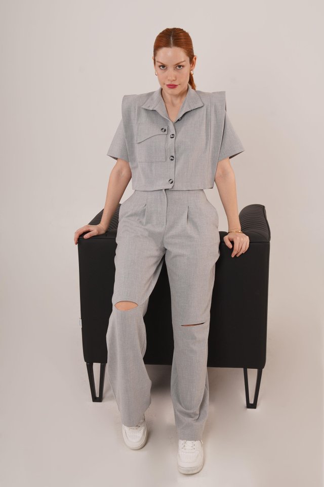 Cepli Düğmeli Bluz Ve Diz Detaylı Pantolon Gri İkili Takım