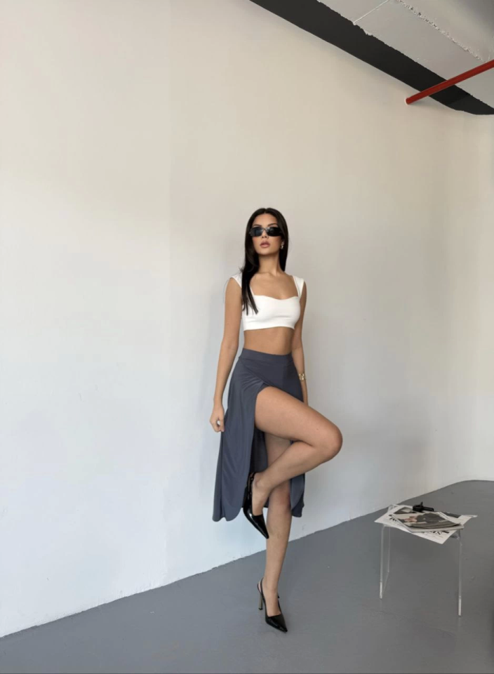 Modelin Ölçüleri: Boy:165, Kg:55, Göğüs:90, Bel:72, Kalça: 100