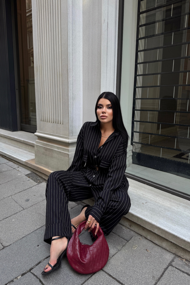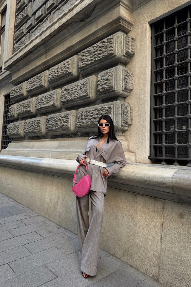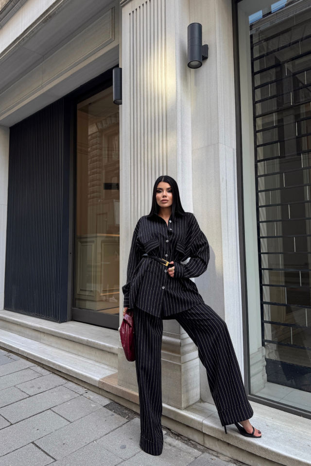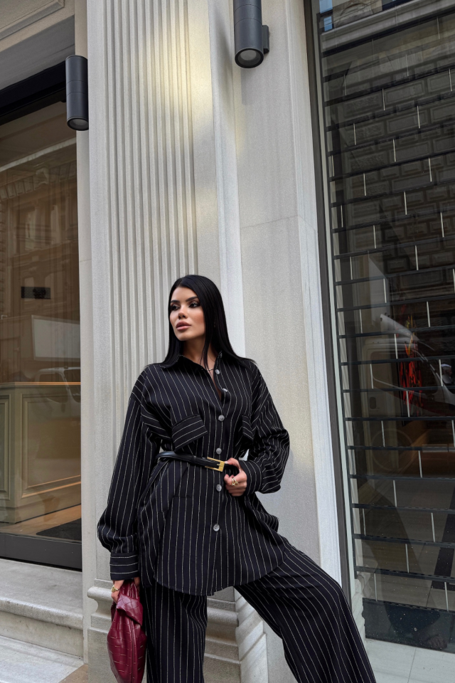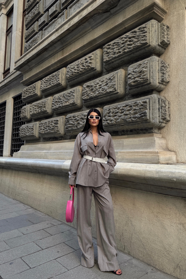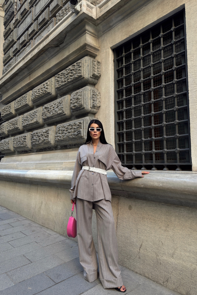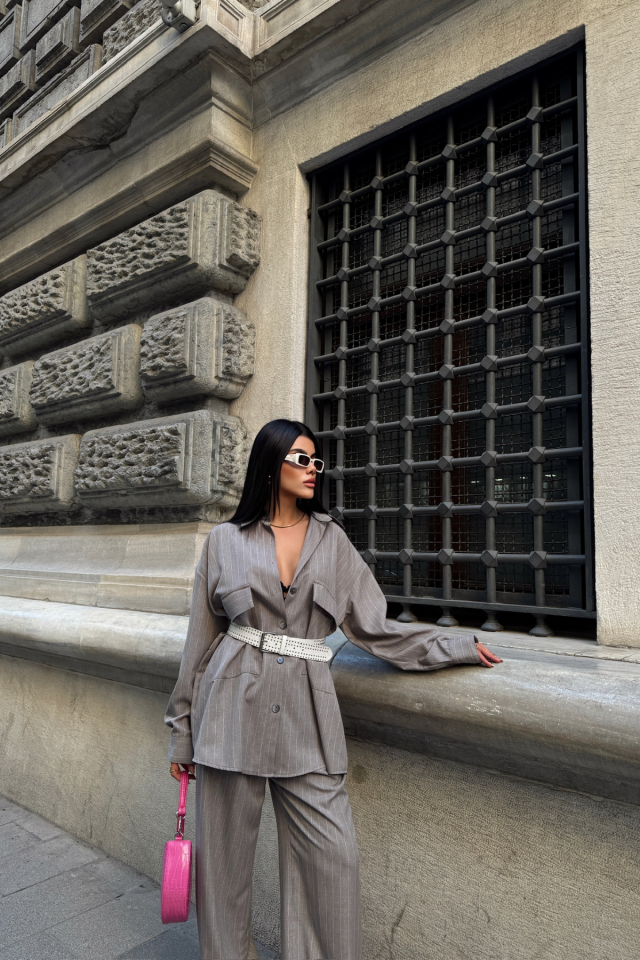 ÇİZGİLİ ARKA TASARIM DETAYLI GÖMLEK-PANTOLON TK – Gri