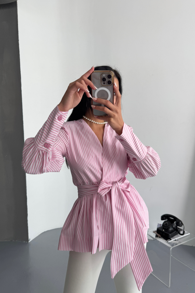 ÇİZGİLİ BAĞLAMA DETAYLI KRUVAZE POPLİN GÖMLEK – Pembe