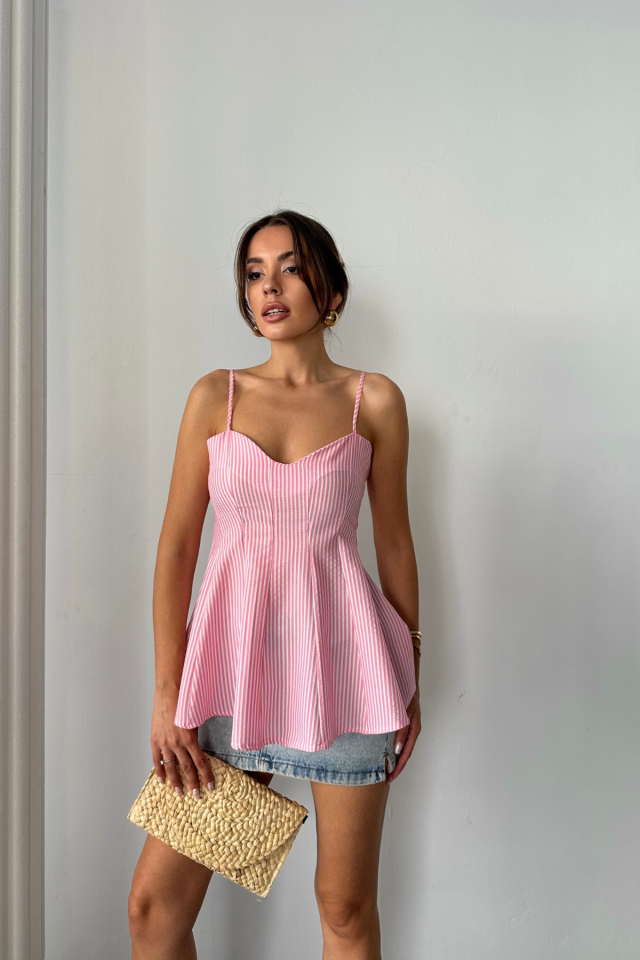 ÇİZGİLİ GOFRE ASKILI PENS DETAYLI BLUZ – Pembe