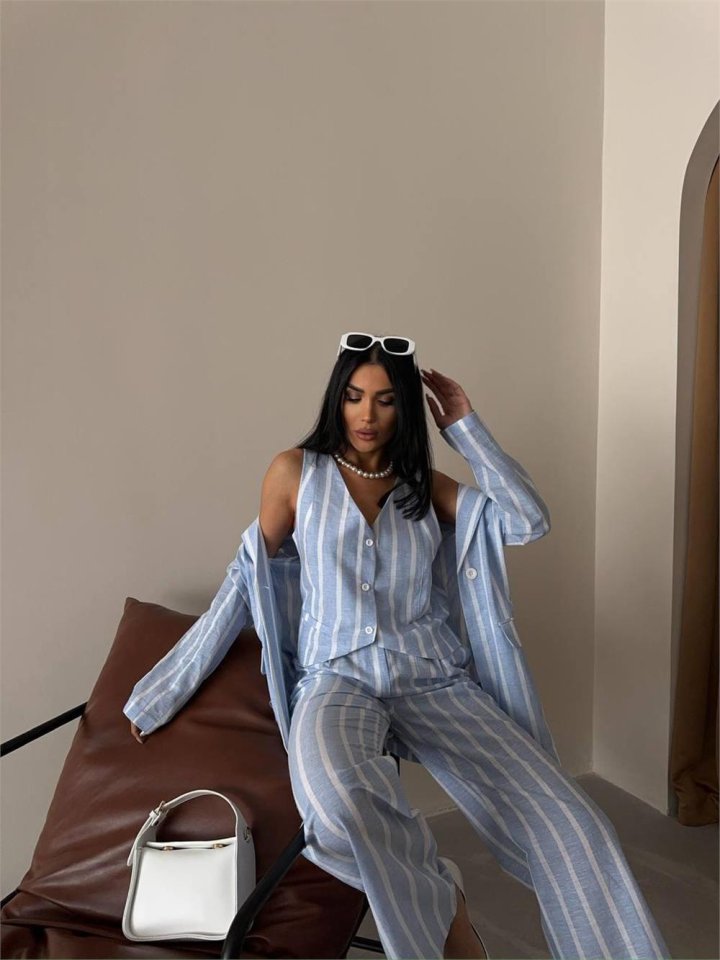 ÇİZGİLİ KETEN YELEK-PANTOLON TAKIM – Pembe