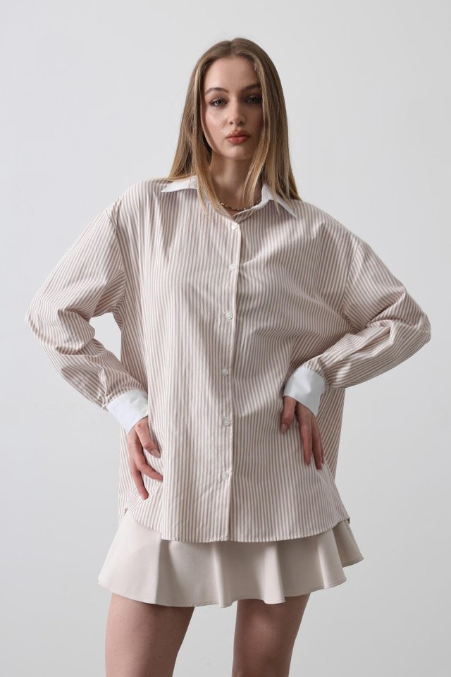 Çizgili Oversize Gömlek – Bej