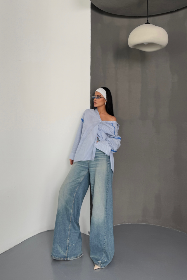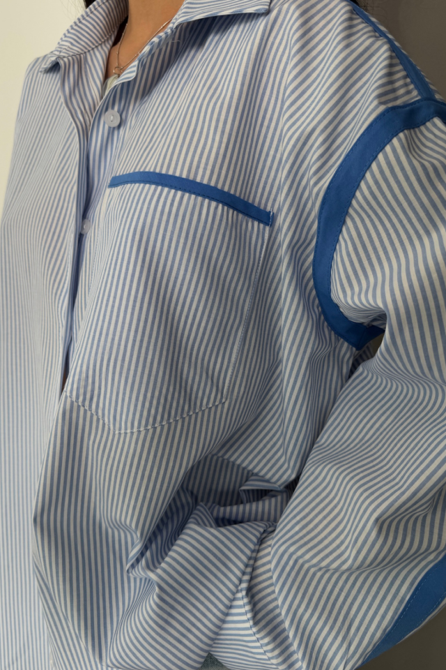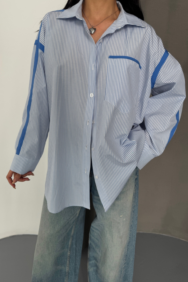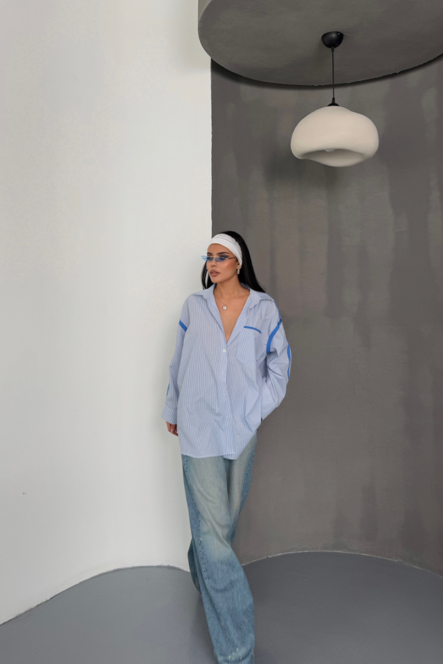 ÇİZGİLİ POLİN GÖMLEK BİYE ŞERİT DETAYLI – Mavi
