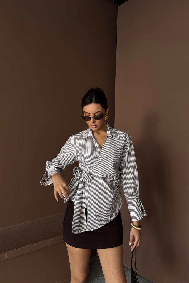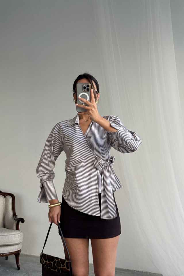 ÇİZGİLİ POPLİN KRUVAZE BAĞLAMALI GÖMLEK – Kahverengi