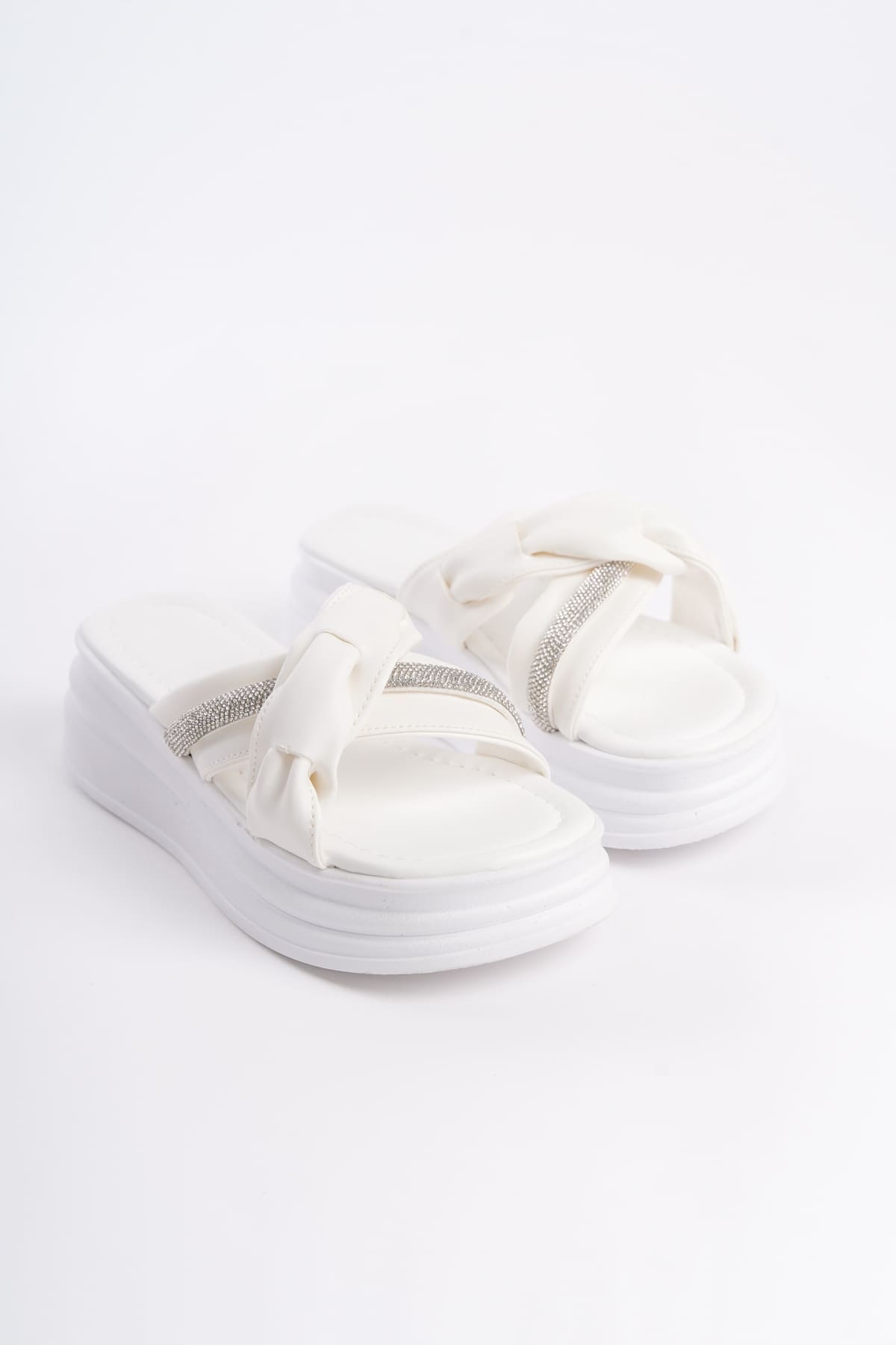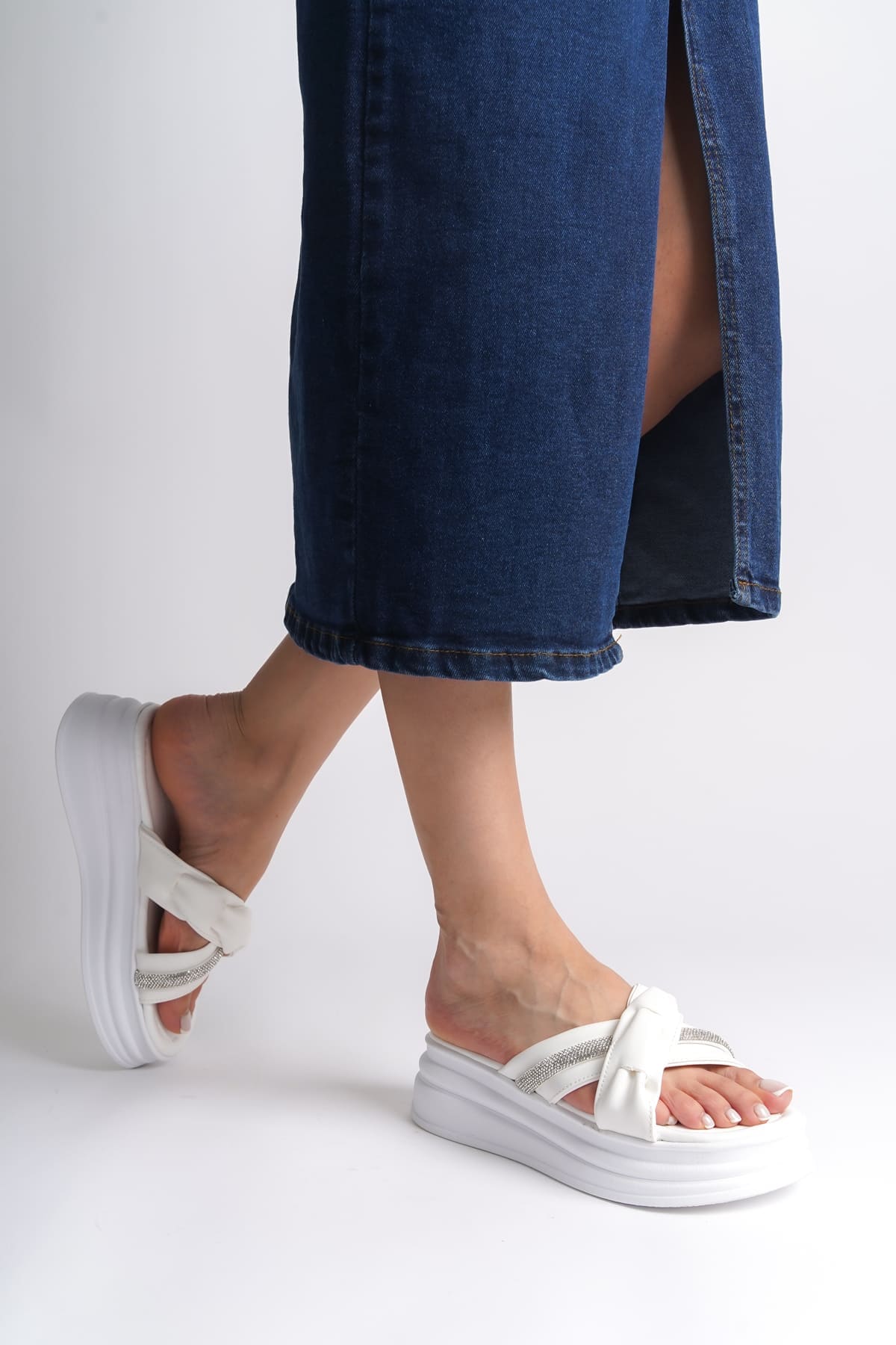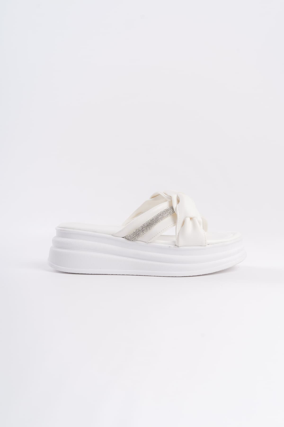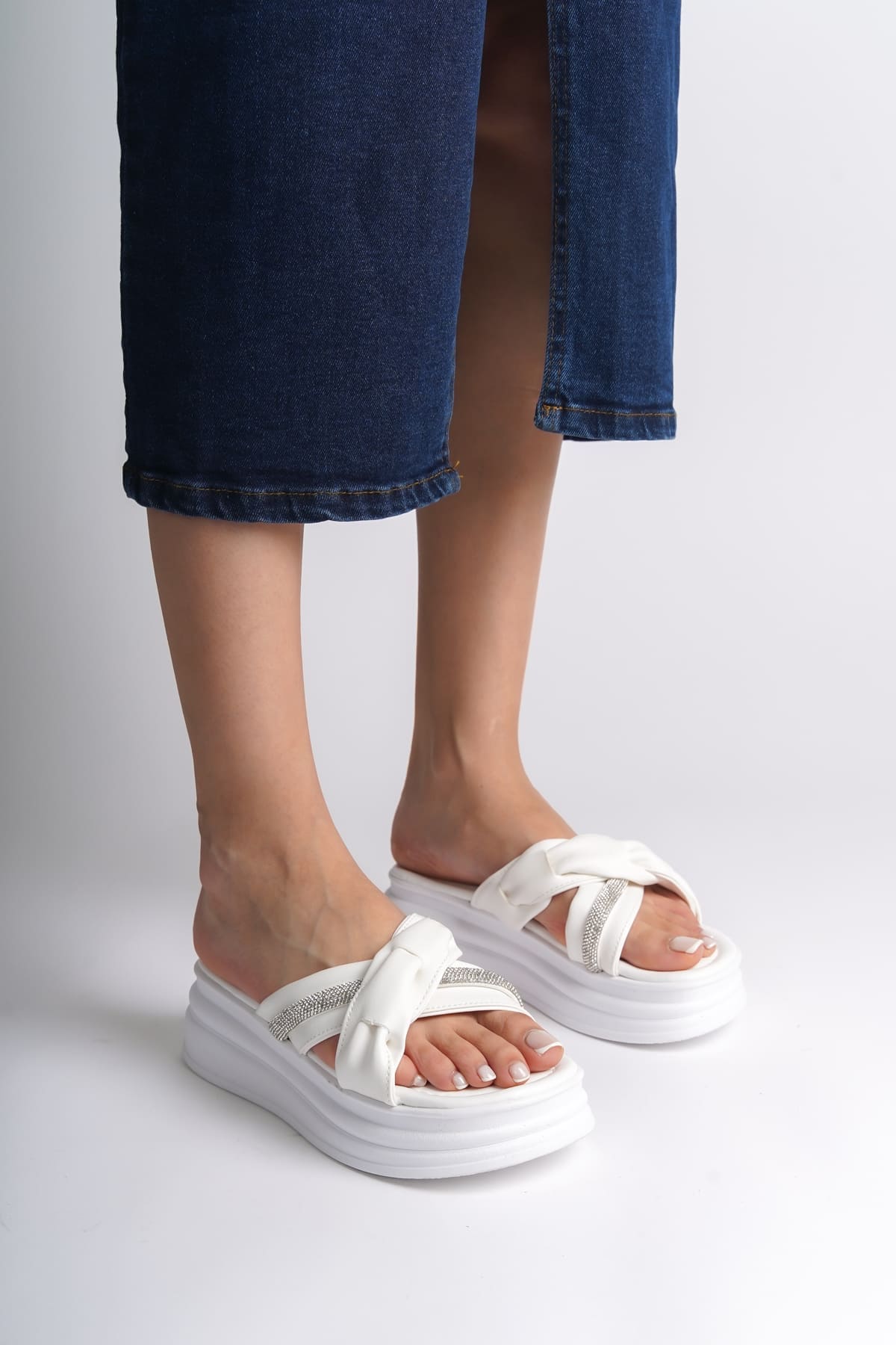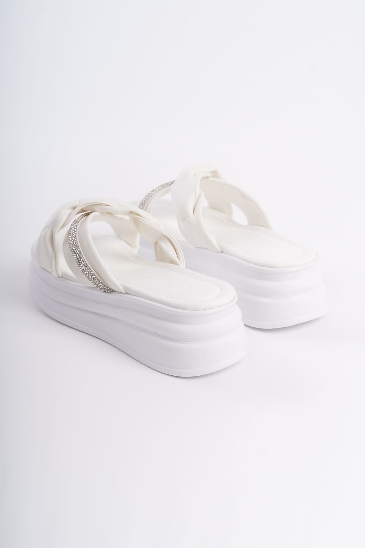 CLARA Düz Topuklu Kurdele Desenli Taşlı Kalın ve Ortopedik Taban Kadın Terlik CBT – Beyaz