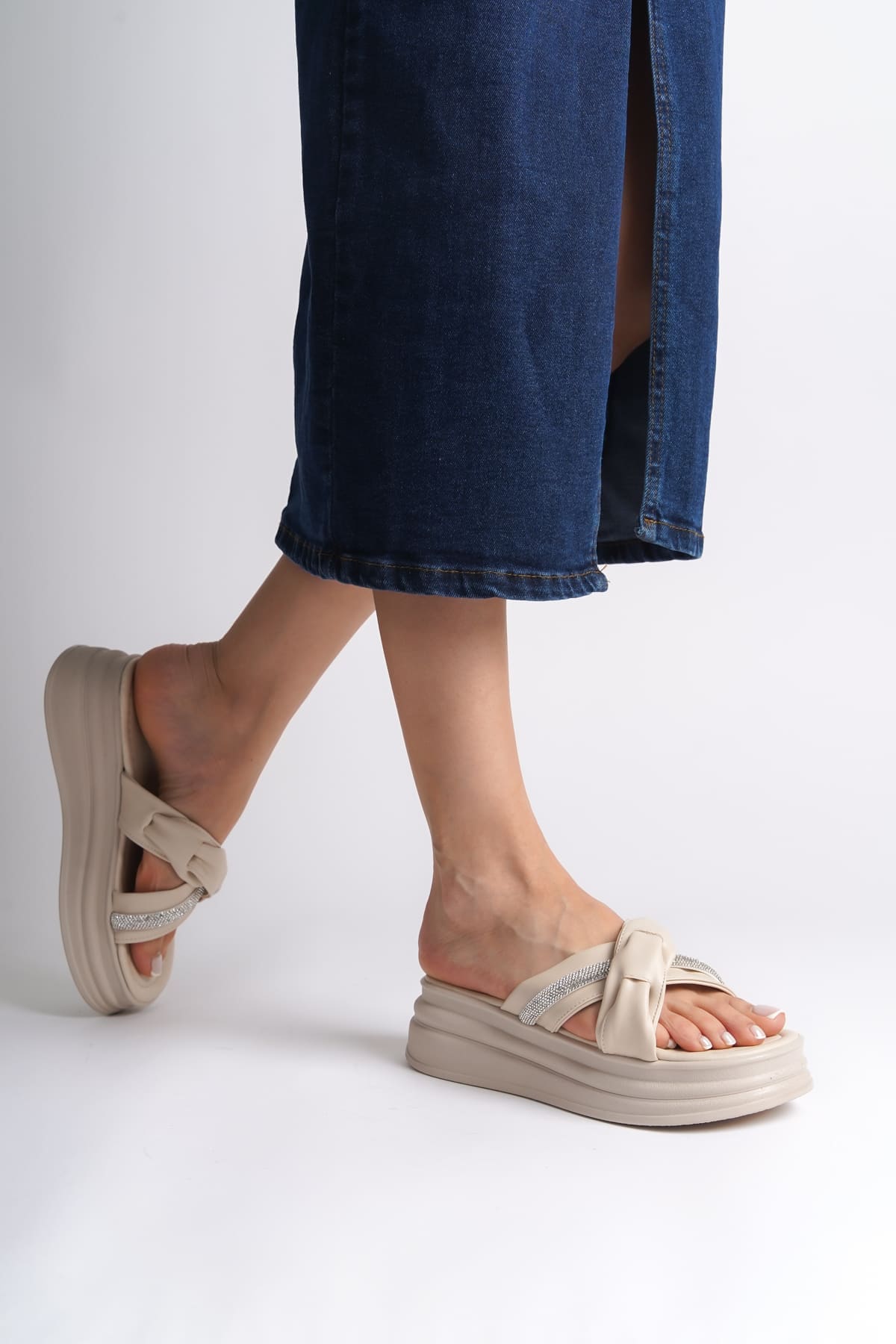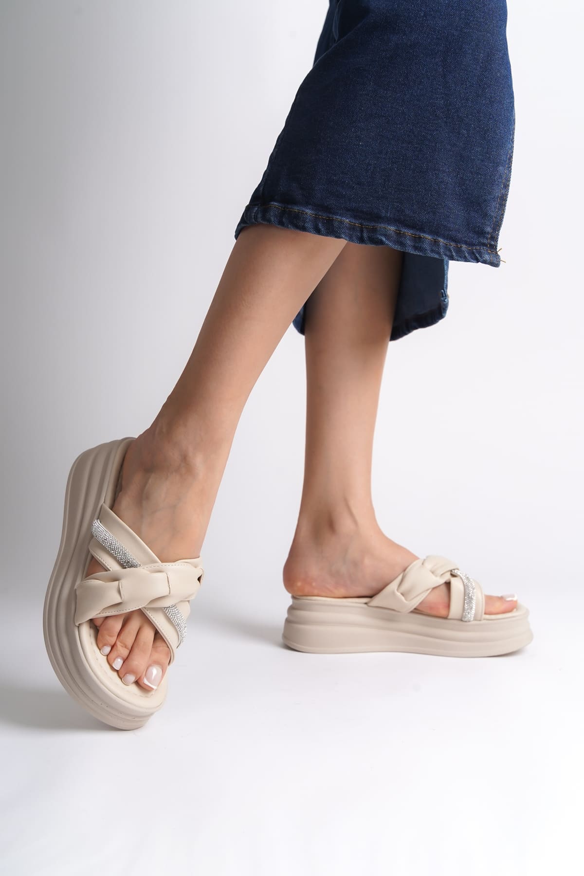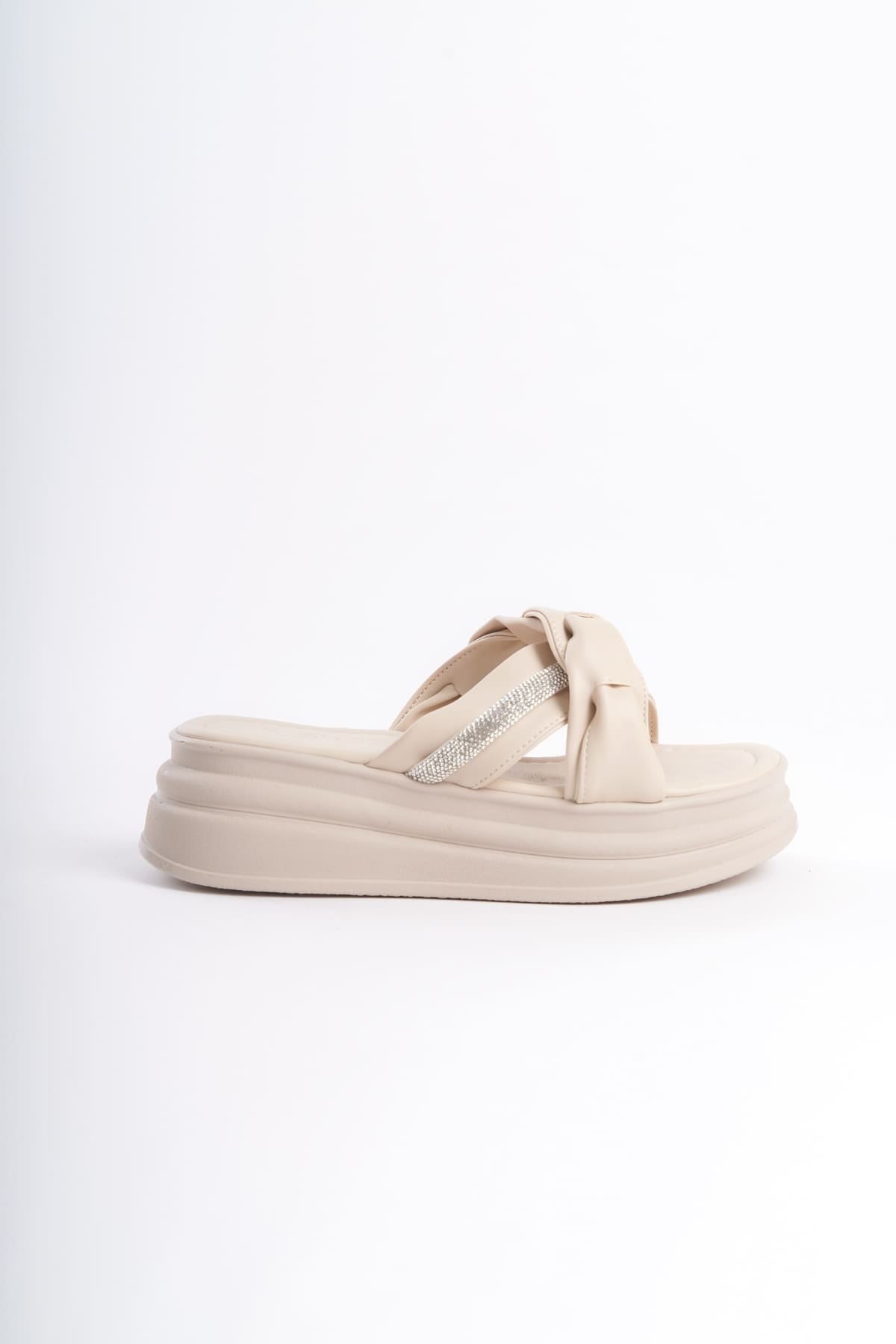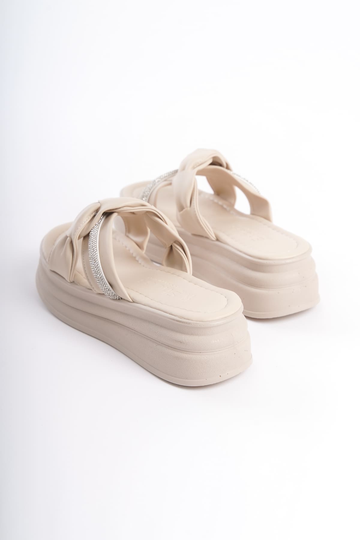 CLARA Düz Topuklu Kurdele Desenli Taşlı Kalın ve Ortopedik Taban Kadın Terlik CKT – Krem