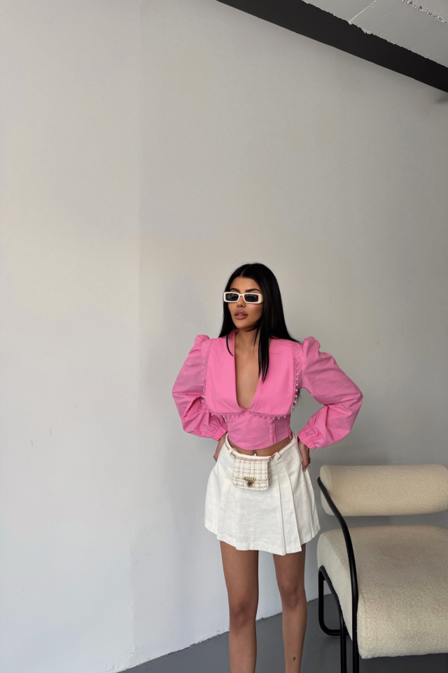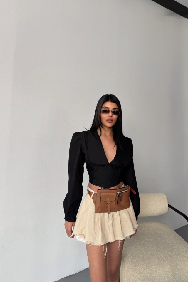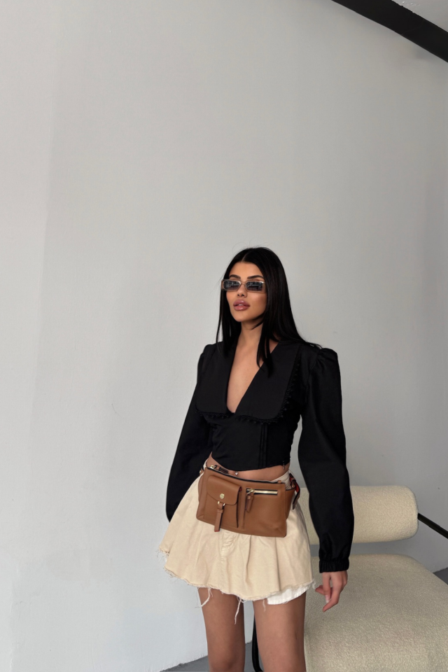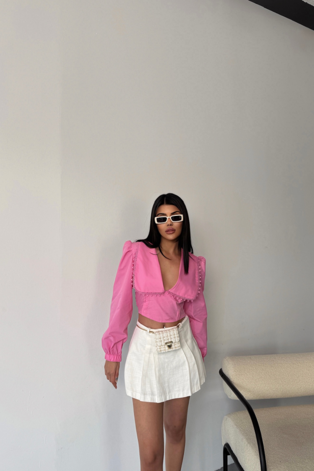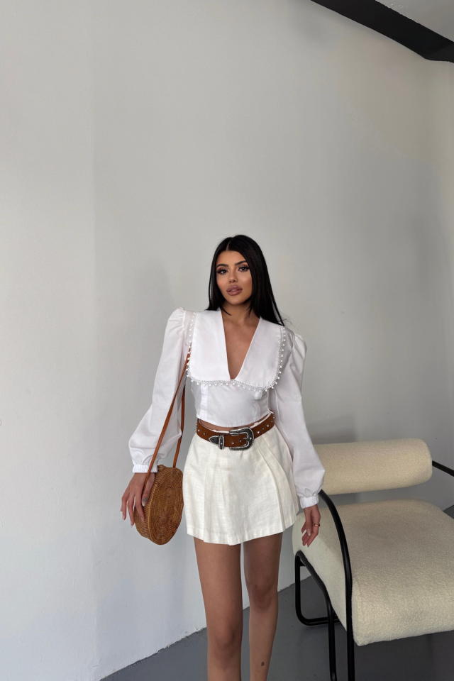CROP POPLİN GÖMLEK YAKA KENAR DANTEL DETAYLI – Beyaz
