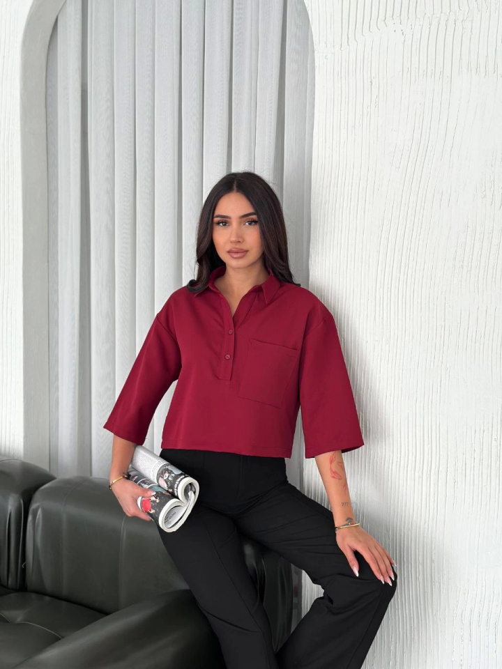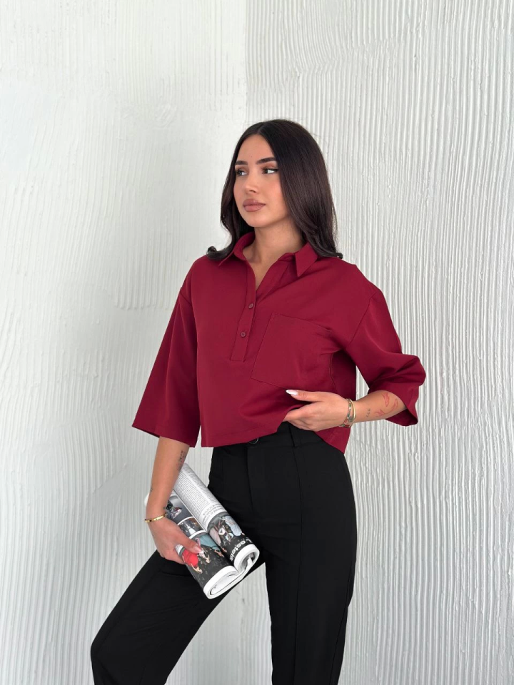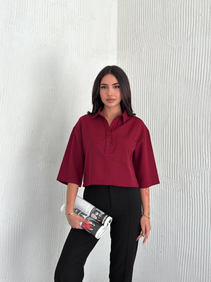 Crop Yakalı Gömlek Üç Çeyrek Sleeve Kol – Bordo