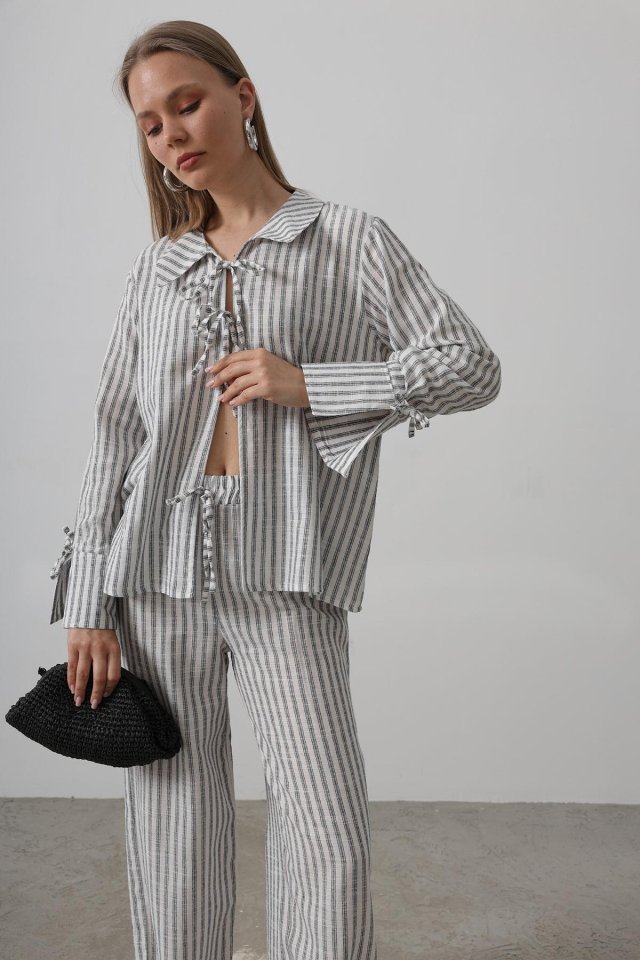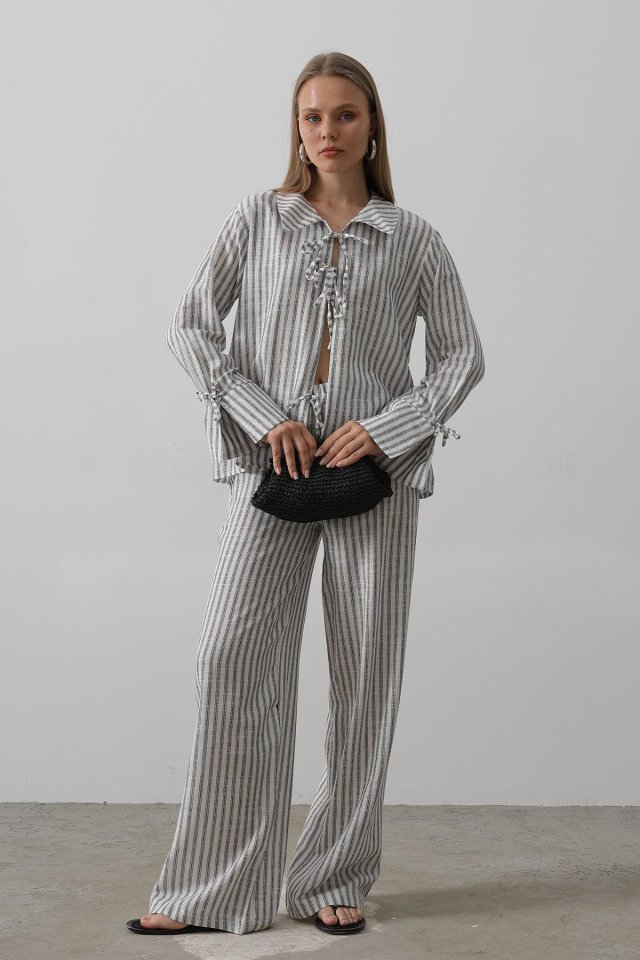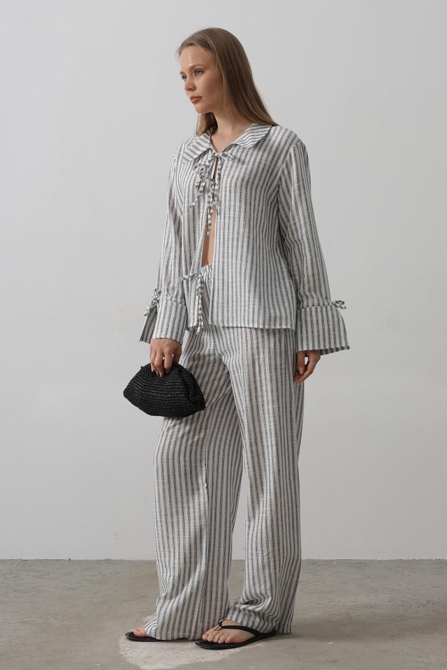 Çzgili Bağlamalı Pantolon Takım – Siyah