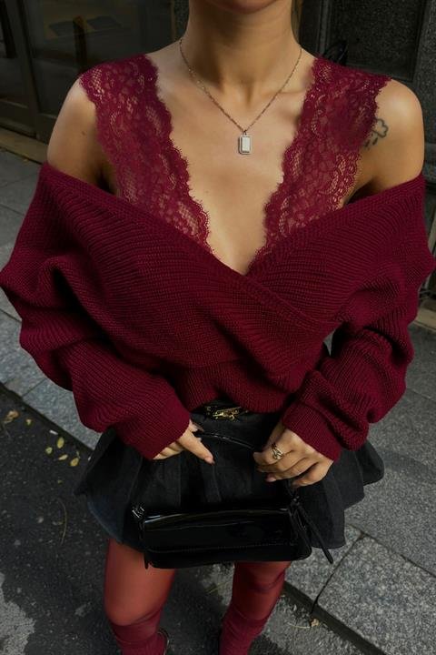 Dantel Detaylı Kruvaze Triko Kazak 1360