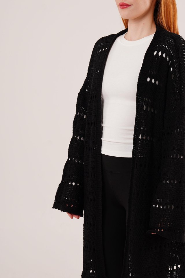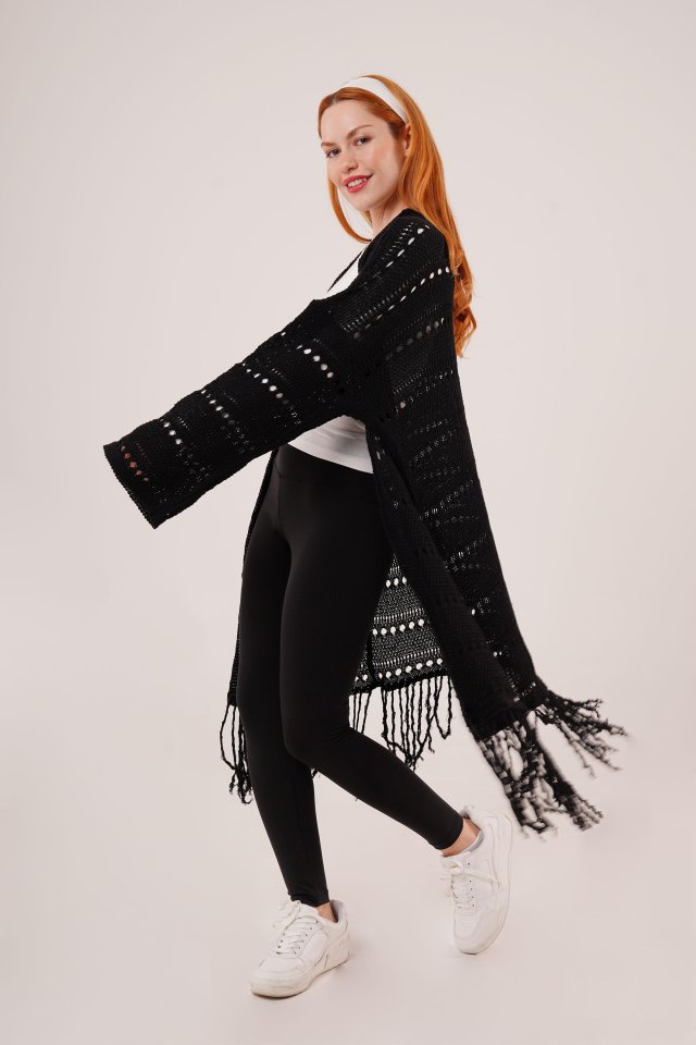 Delikli Geçişli Püskül Detay Uzun Triko Krem Hırka