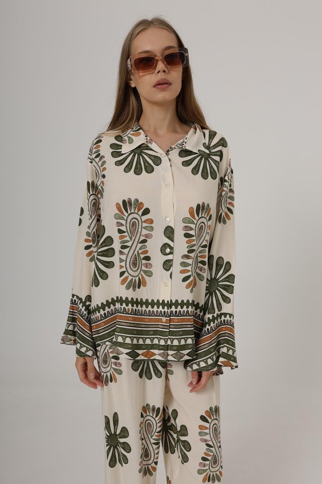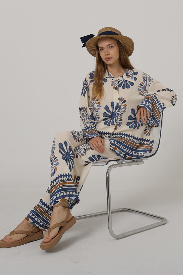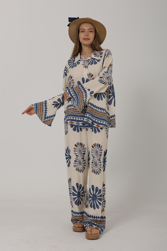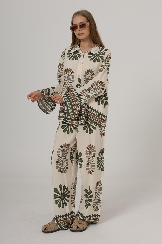 Desenli Kolları Volanlı Pantolon Takım – Antrasit