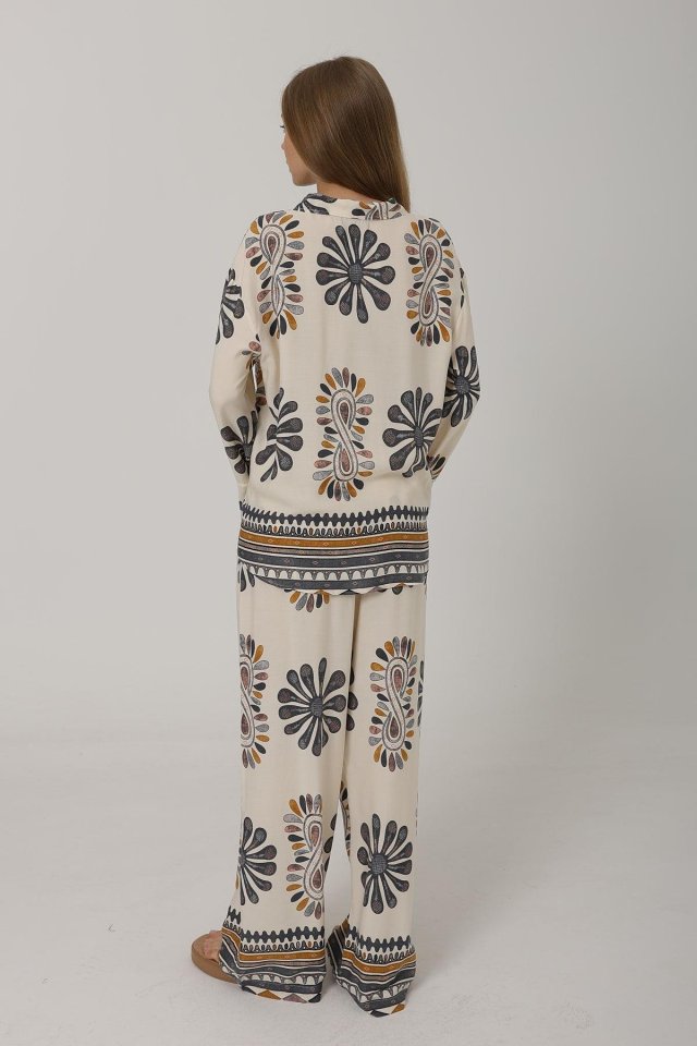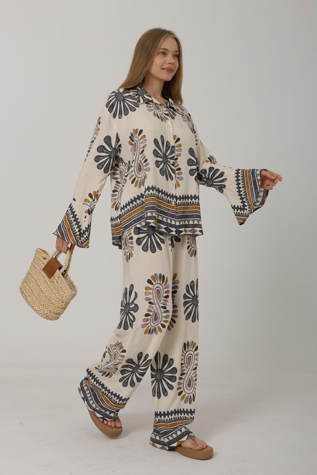 Desenli Kolları Volanlı Pantolon Takım – Antrasit