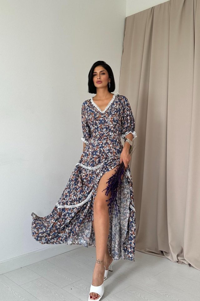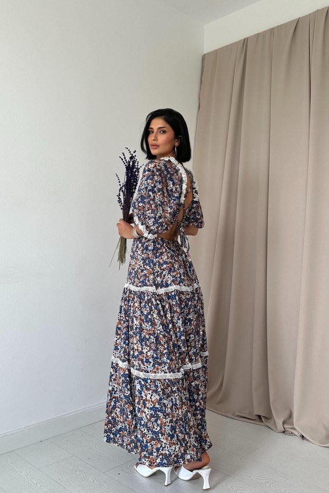 Desenli Sırtı Dekolteli Brode Elbise