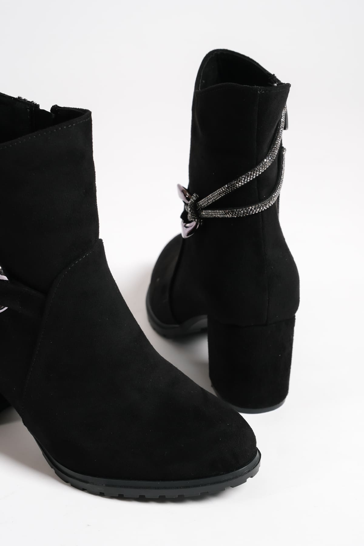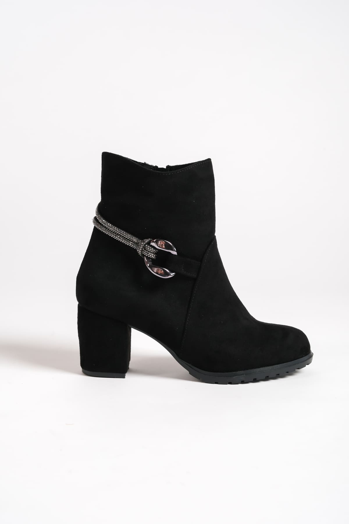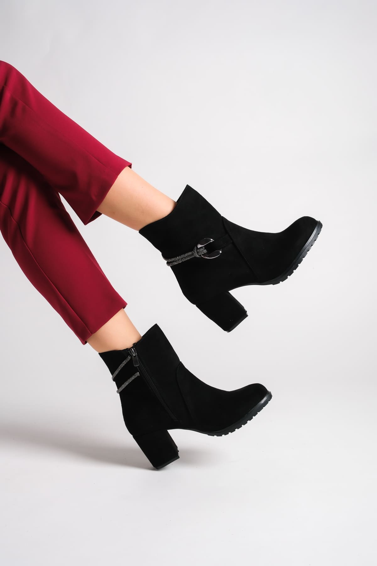 EDNA Fermuarlı Ortopedik Taban Taşlı Topuklu Süet Kadın Bot SST – Siyah