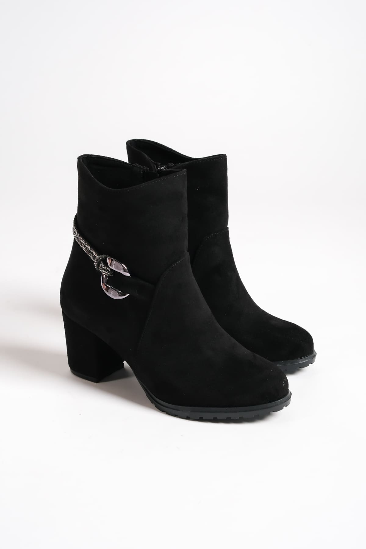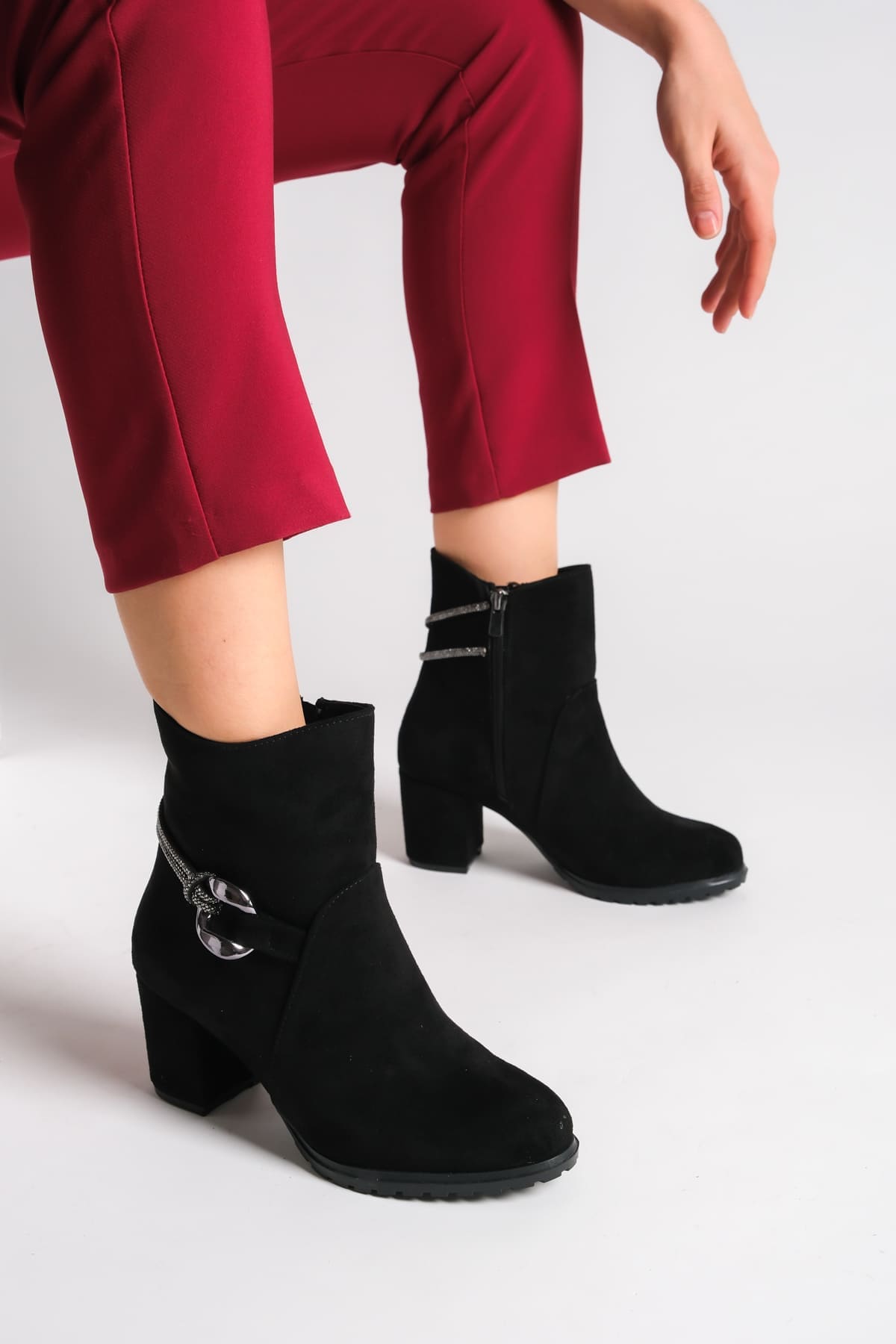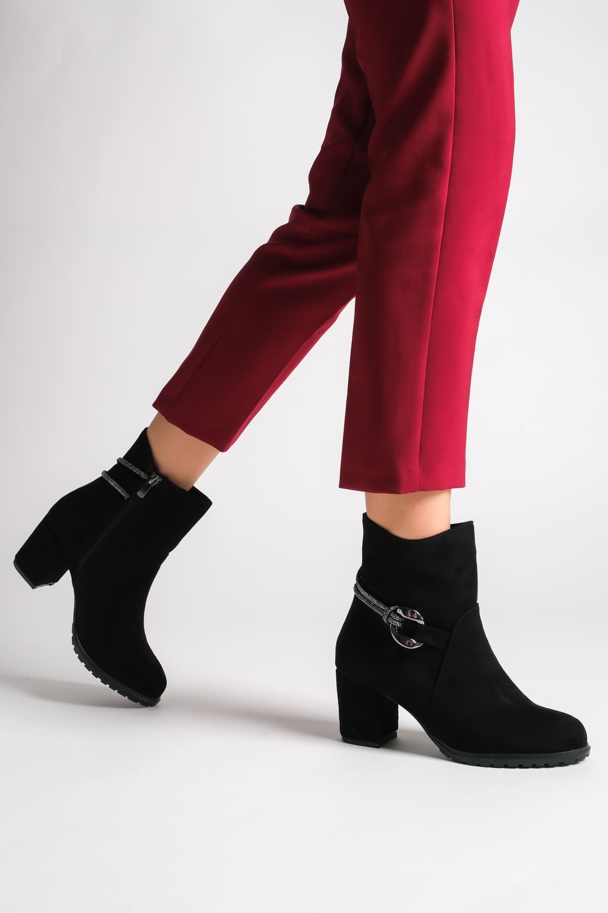 EDNA Fermuarlı Ortopedik Taban Taşlı Topuklu Süet Kadın Bot SST – Siyah