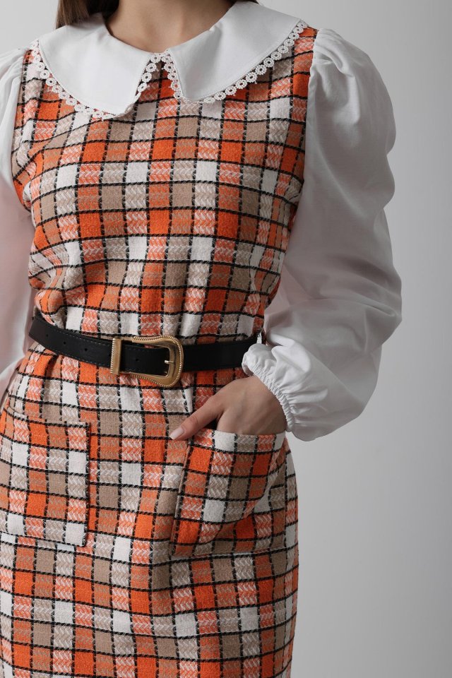 Ekoseli Gömlek Detaylı Elbise – Oranj
