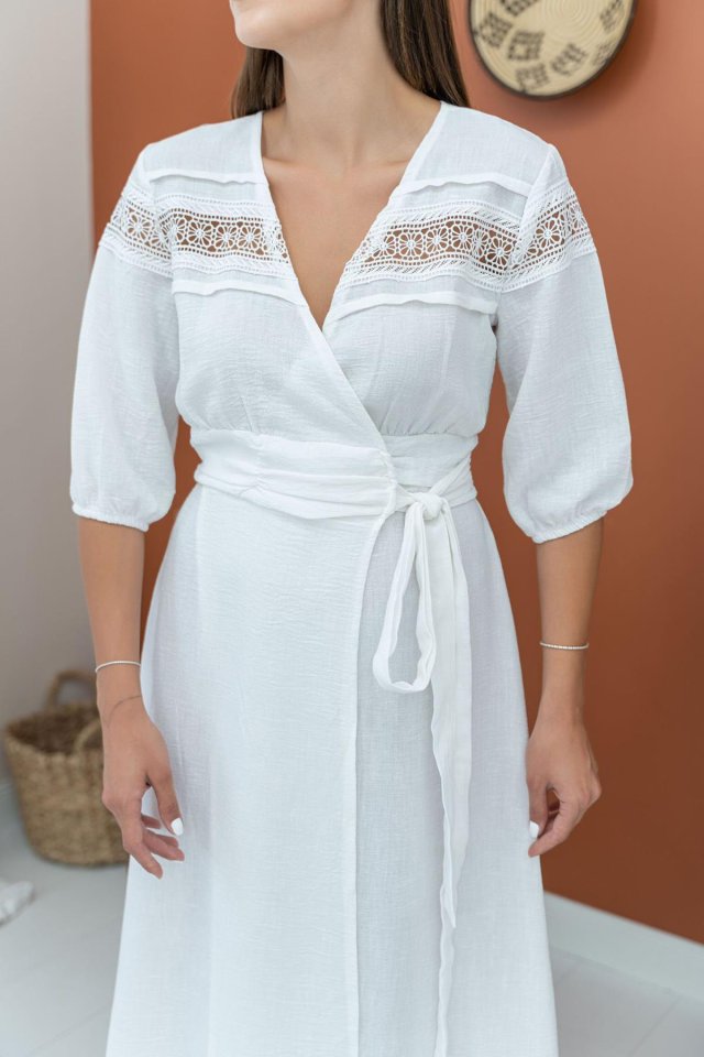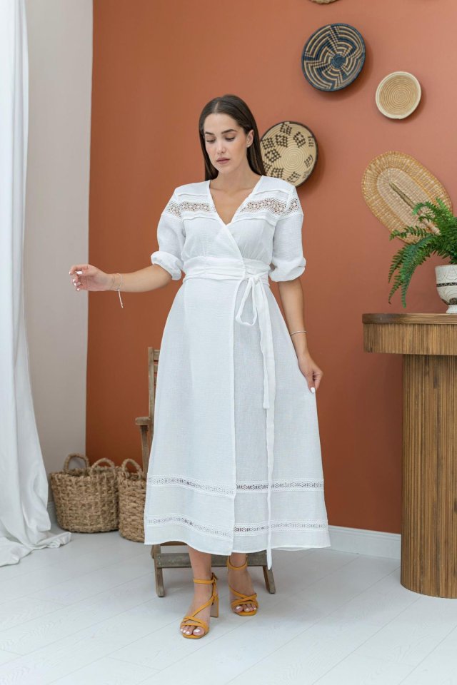 Ekru Dantel Detay Keten Elbise