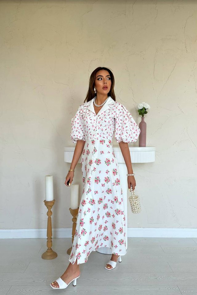 Ekru Dijital Baskılı Elbise