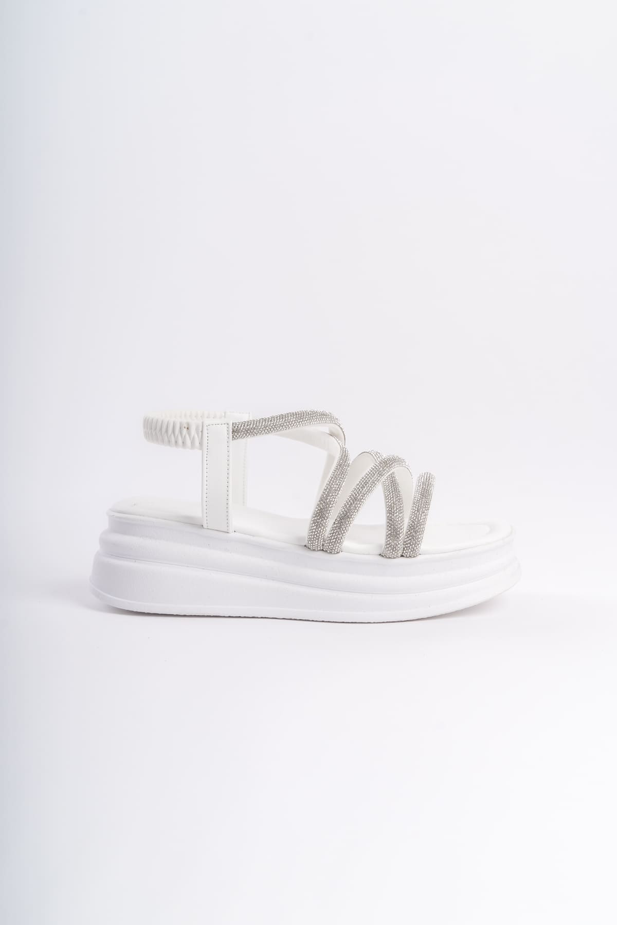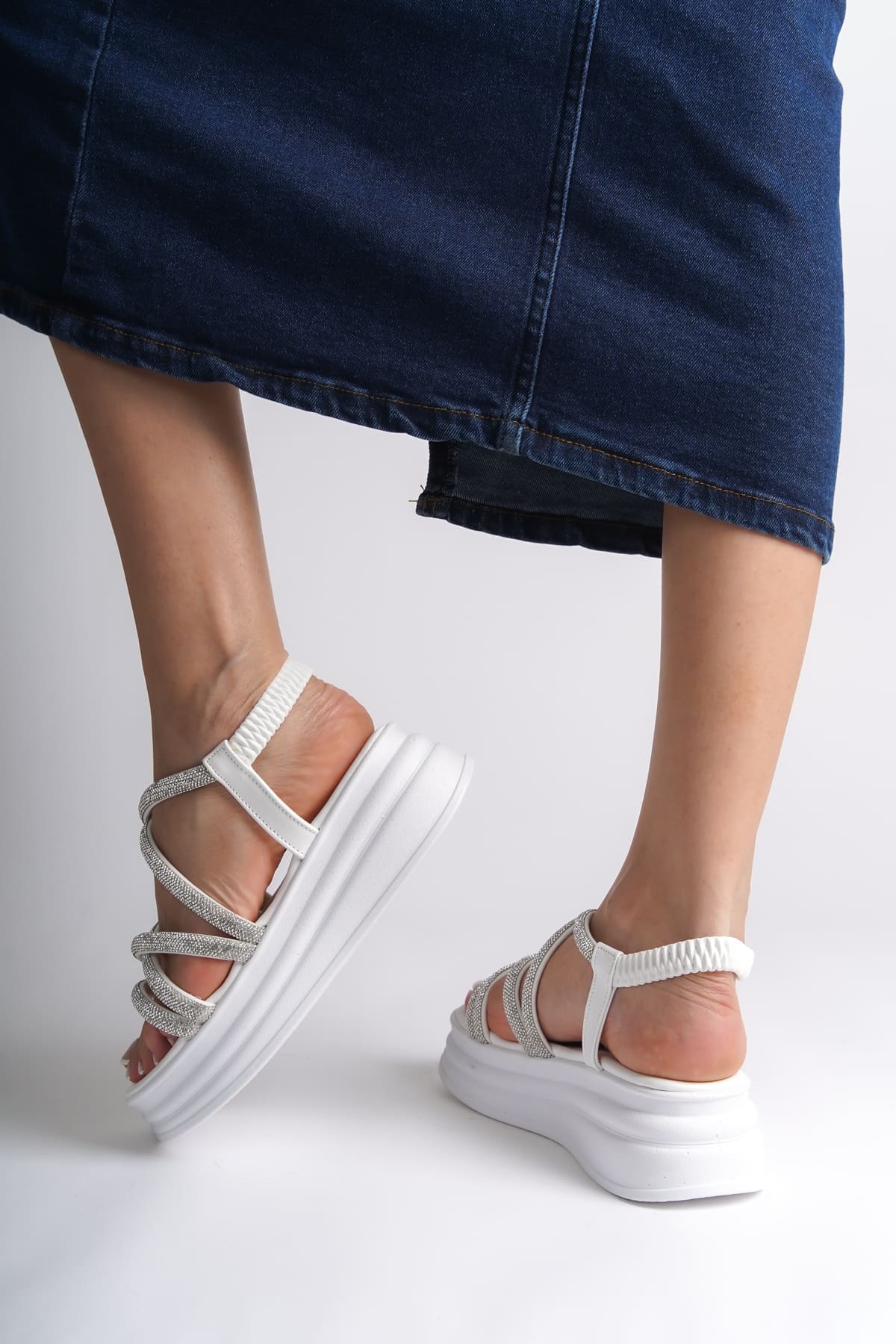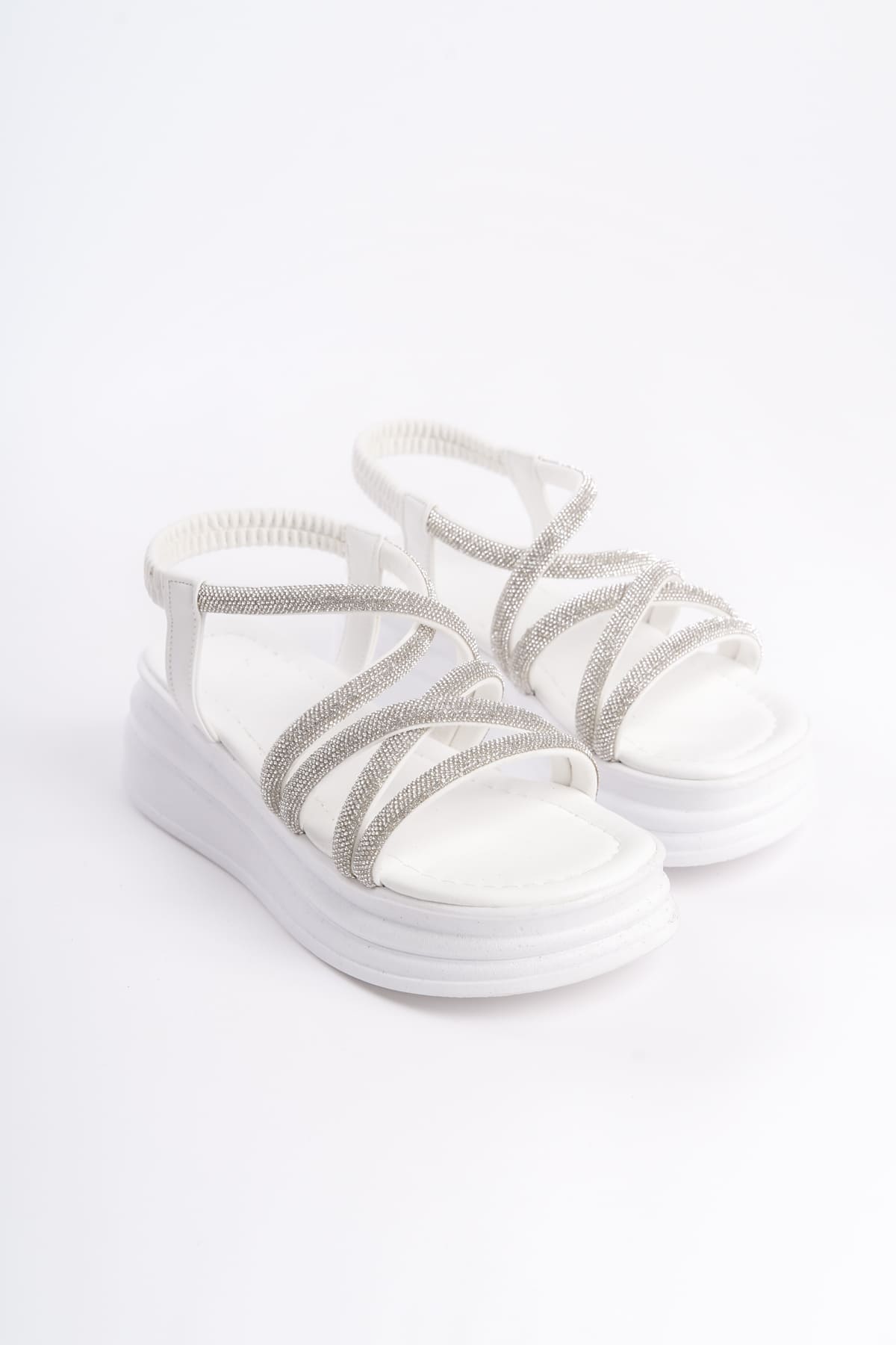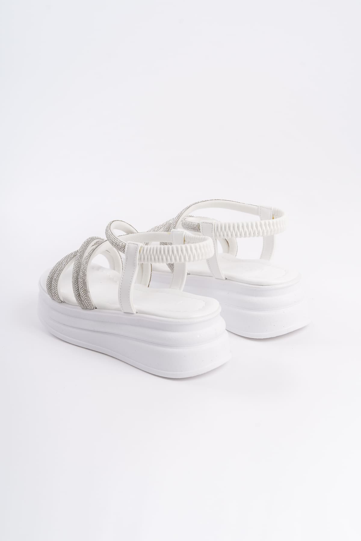ELENA Lastikli Taşlı Şeritli Ortopedik Taban Kadın Sandalet CBT – Beyaz
