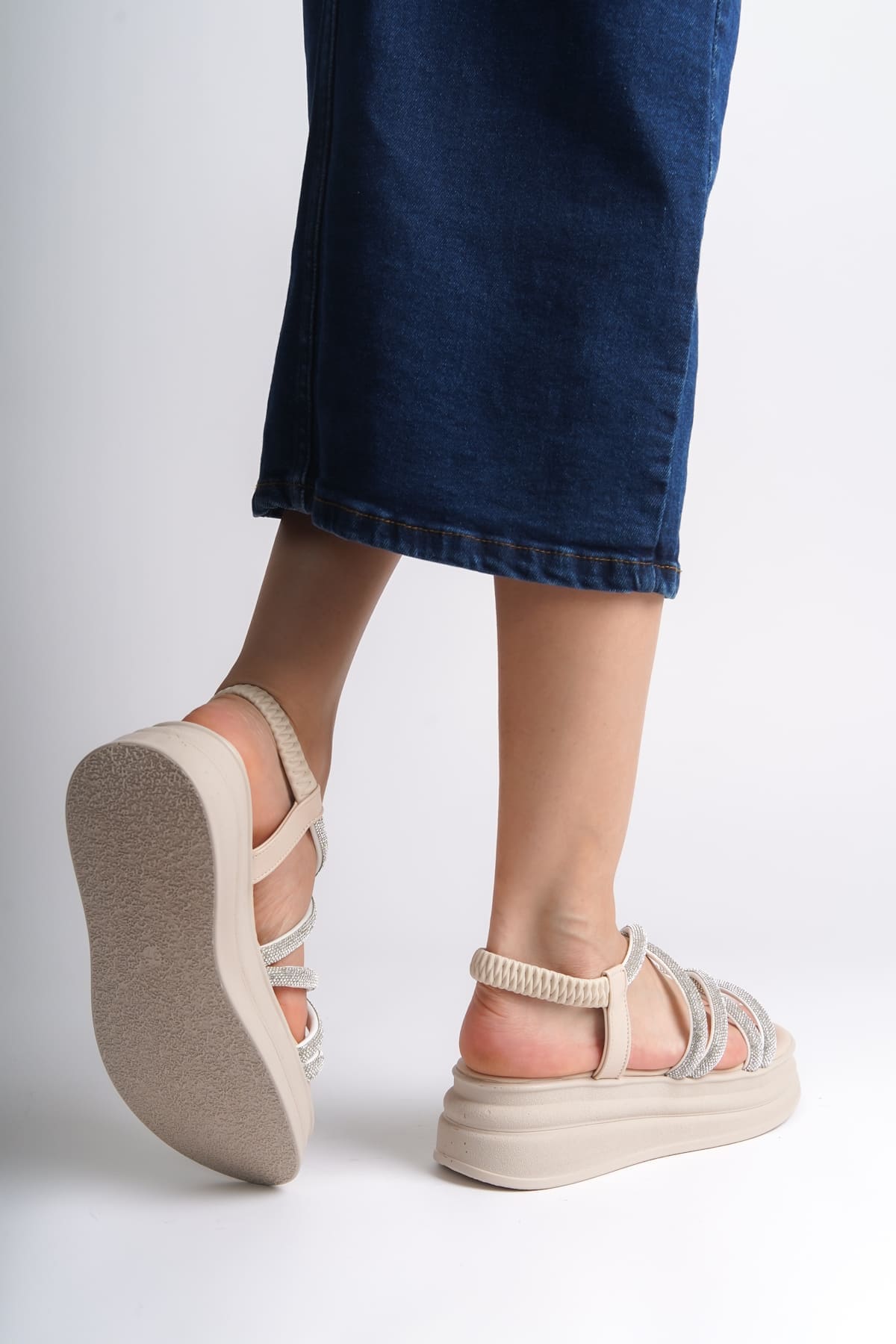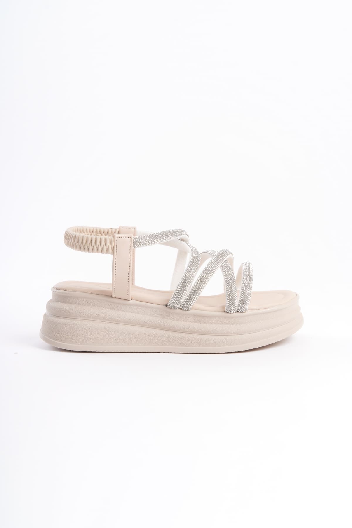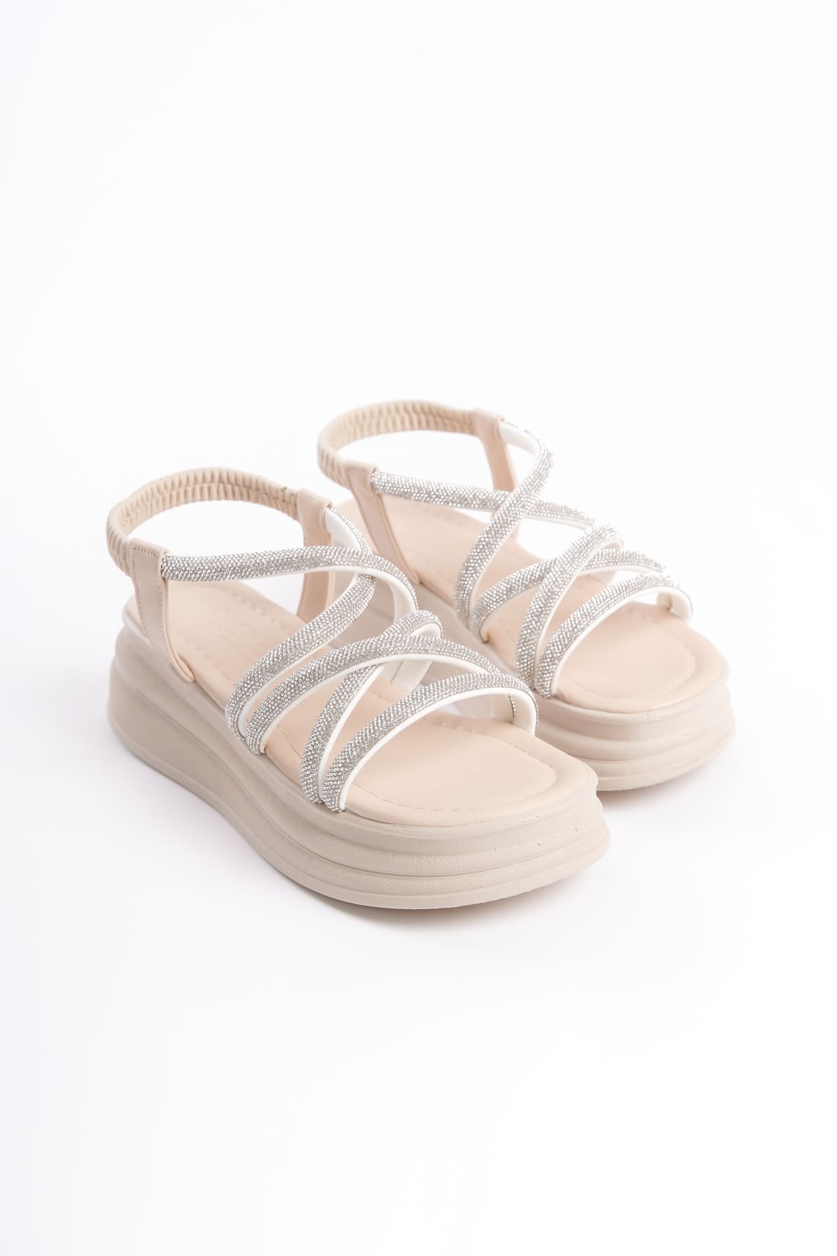 ELENA Lastikli Taşlı Şeritli Ortopedik Taban Kadın Sandalet CKT – Krem