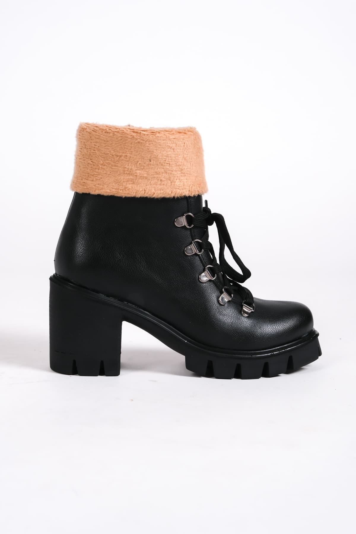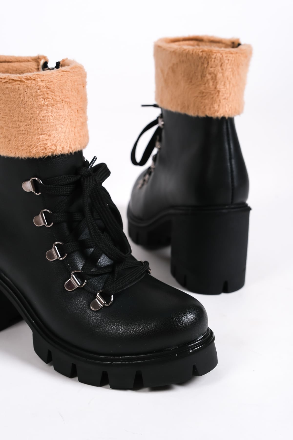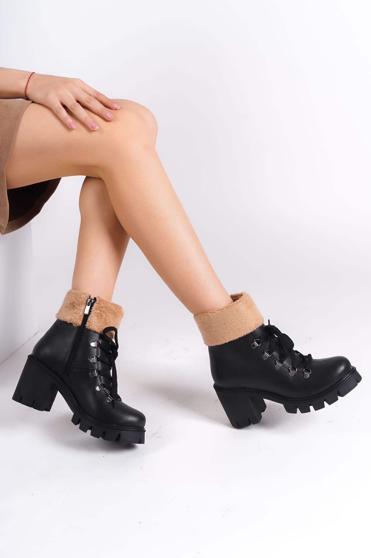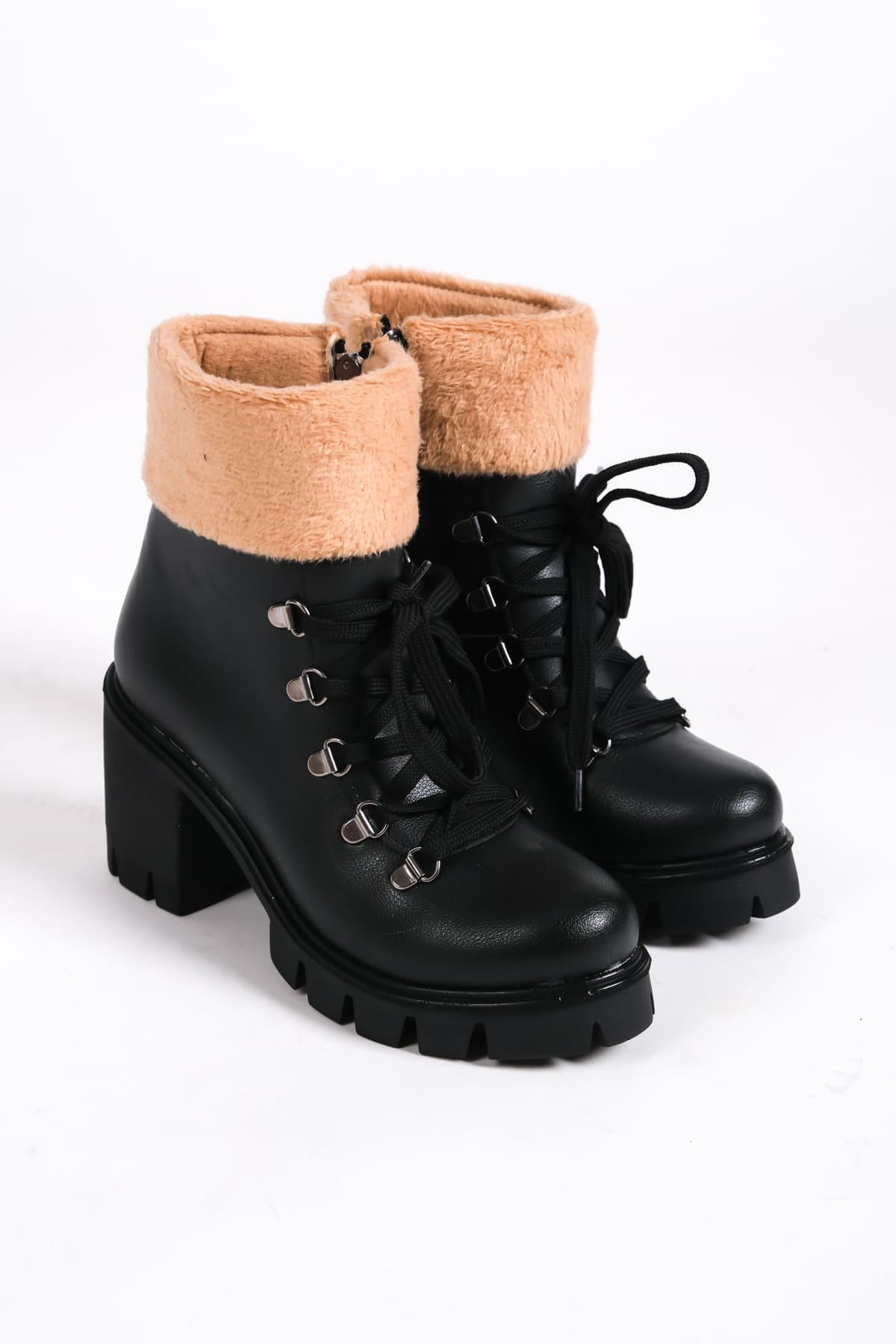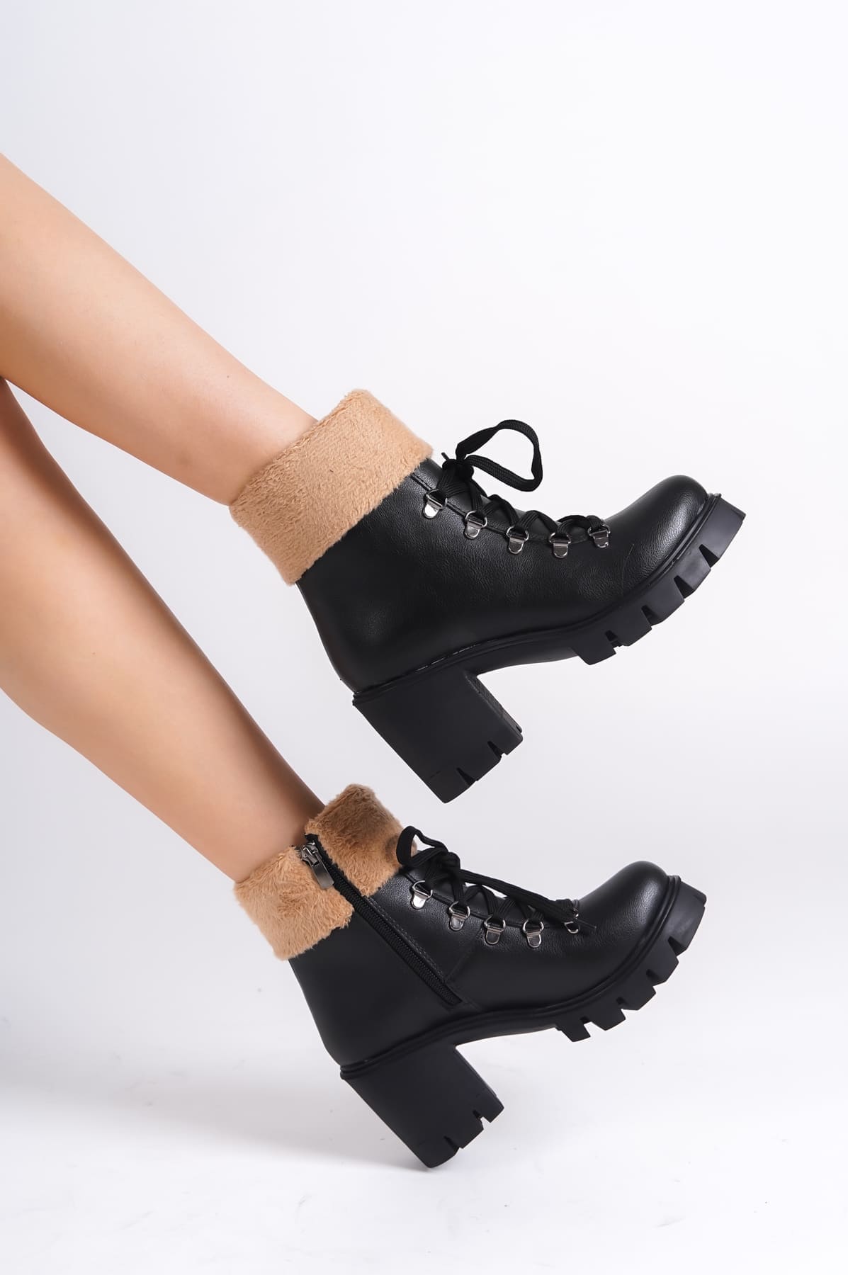 EMMA Bağcıklı Fermuarlı Ortopedik Taban Topuklu Kürk DetaylıKadın Bot CST – Siyah