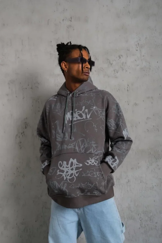 Erkek Baskılı Kapüşonlu Ribanalı Sweat – Gri