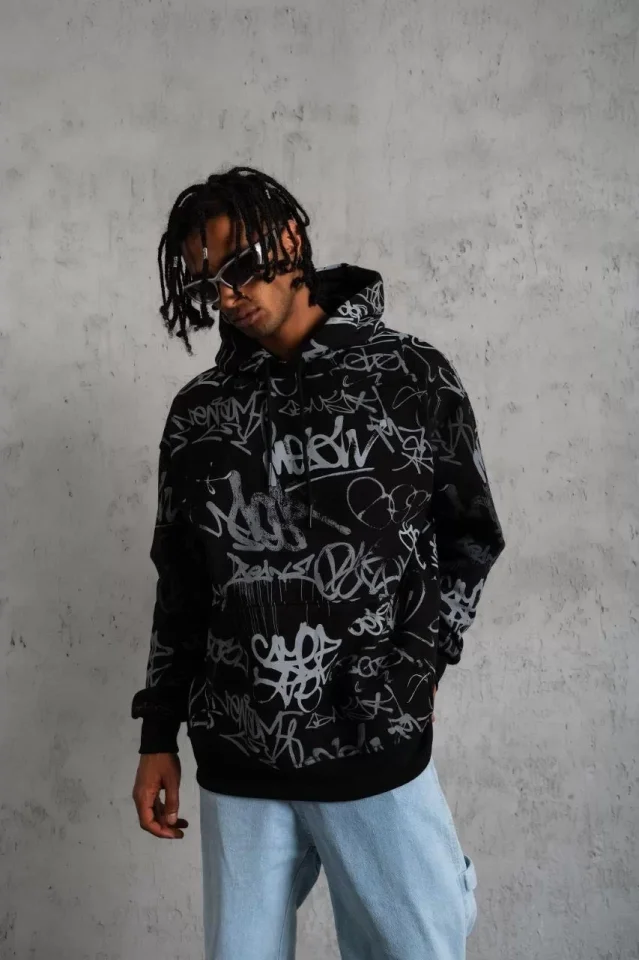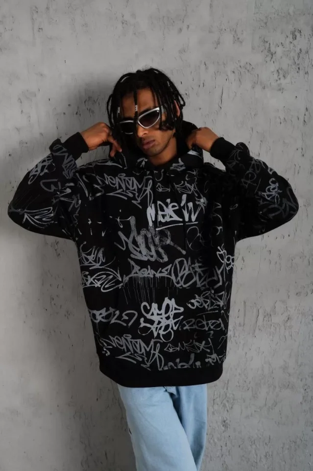 Erkek Baskılı Kapüşonlu Ribanalı Sweat – Siyah