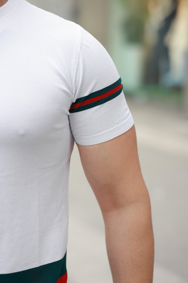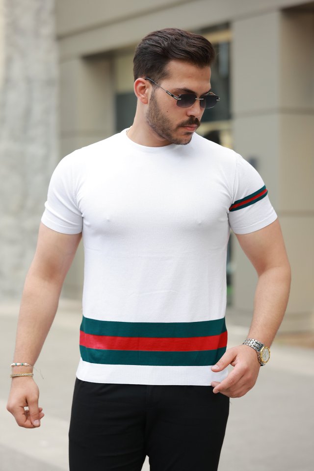 Erkek Bisiklet Yaka Bel Ve Kol şerit Desenli Kısa Kollu Tişört