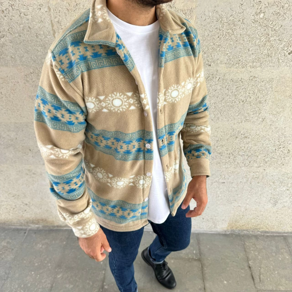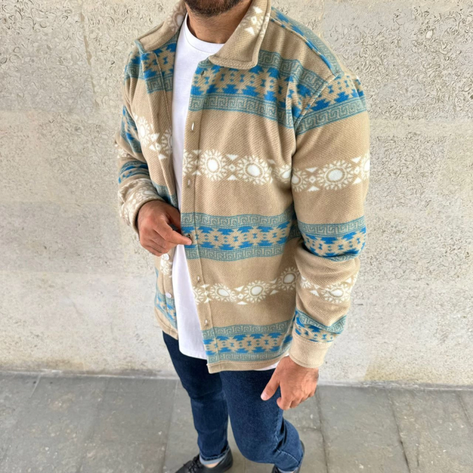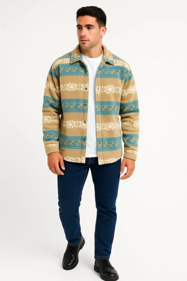 Erkek Desenli Polar Gömlek – Etnik Şerit Desen Yakalı, Uzun Kollu, Düğmeli, Oversize Rahat Kalıp – Sarı