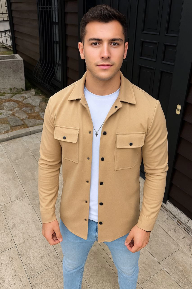 Erkek Diagonal Kumaş Cepli Çıtçıtlı Uzun Kollu, Gömlek Oversize Rahat Kalıp Günlük Şık Stil – Bej