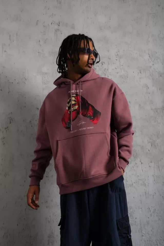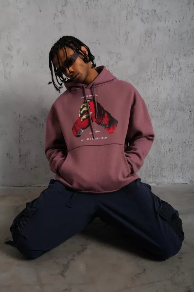 Erkek Eldiven Baskılı Kapüşonlu Sweat – Gül Kurusu
