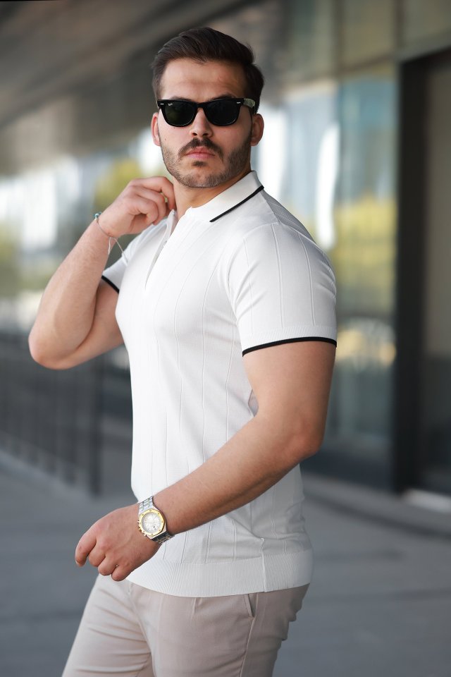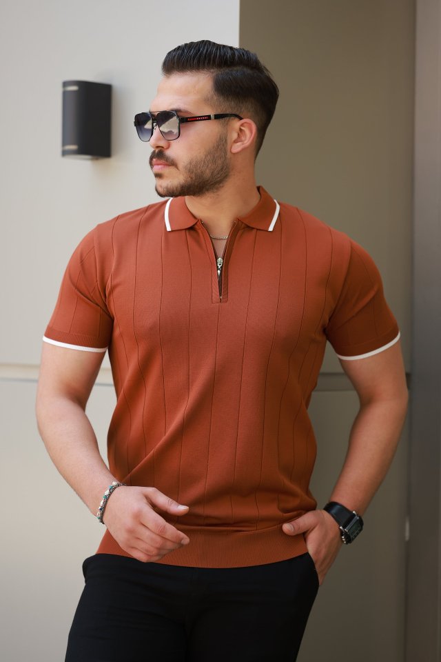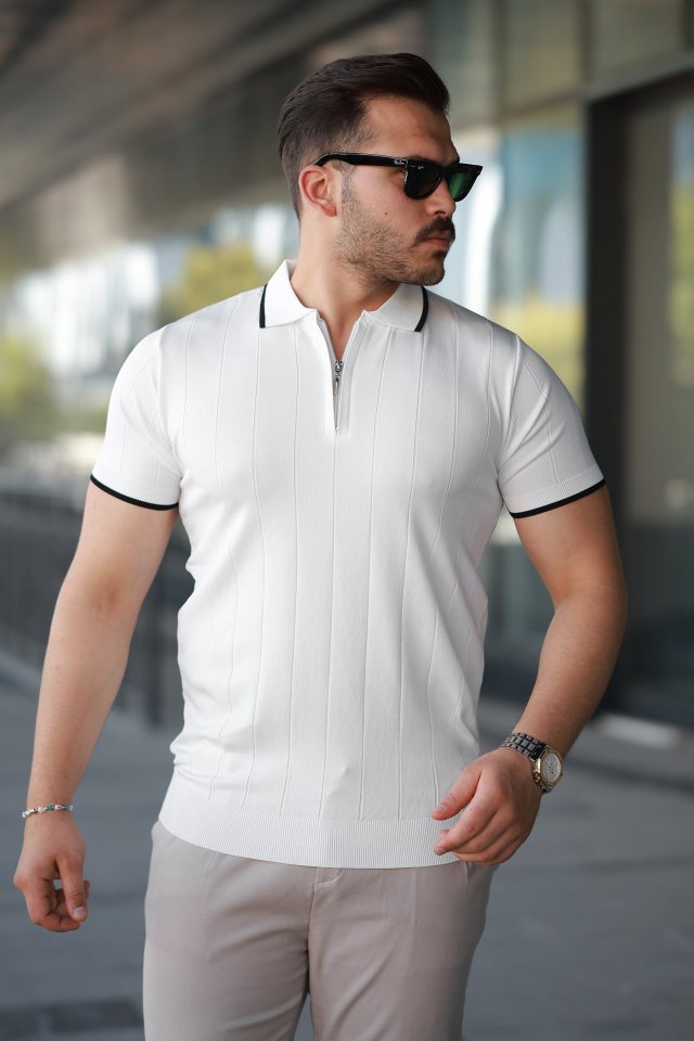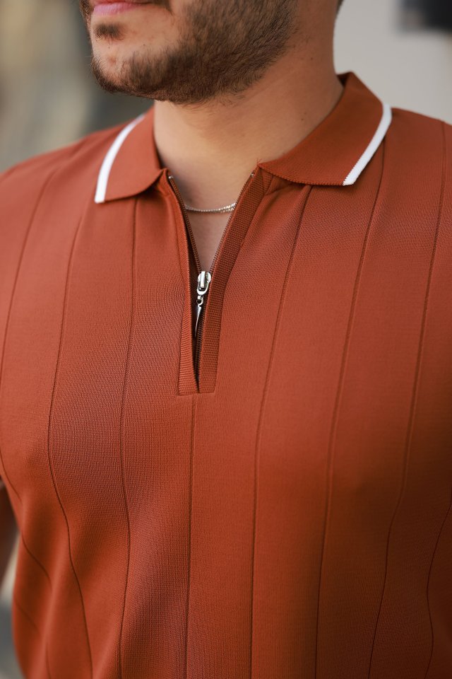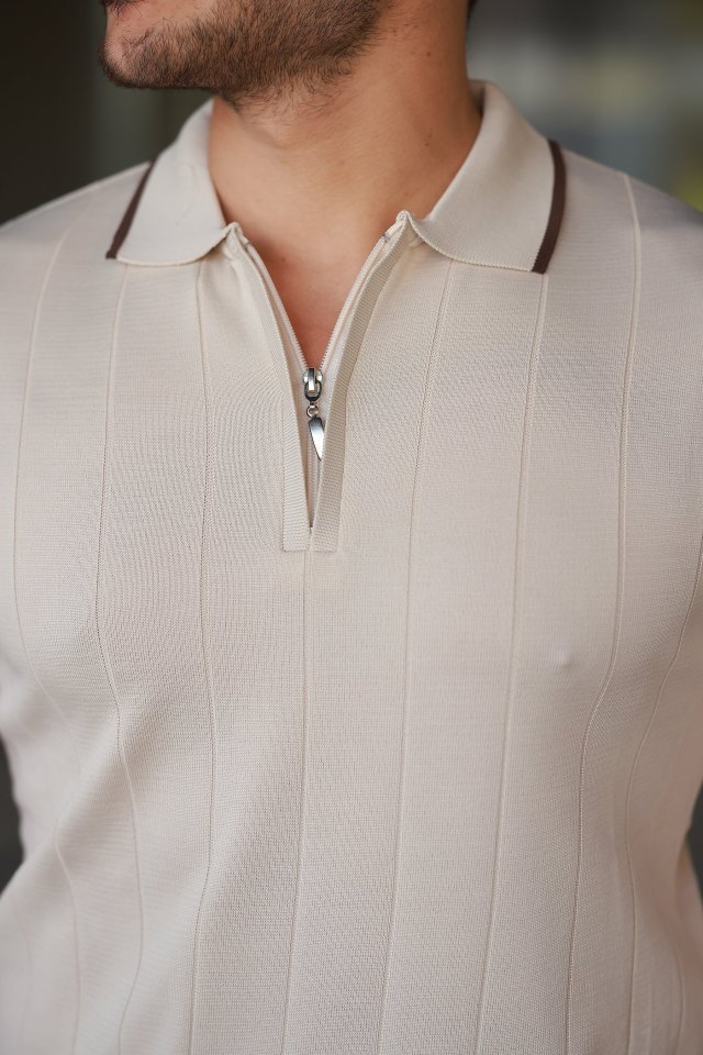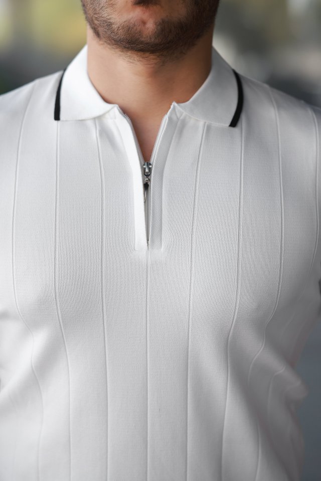 Erkek Fermuar Yakalı çizgi Dokulu Kısa Kollu Tişört