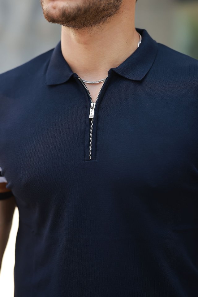 Erkek Fermuar Yakalı Kolları Desenli Kısa Kollu Tişört