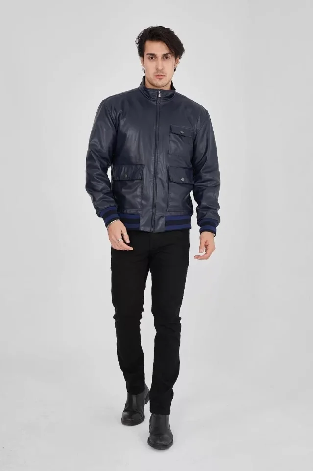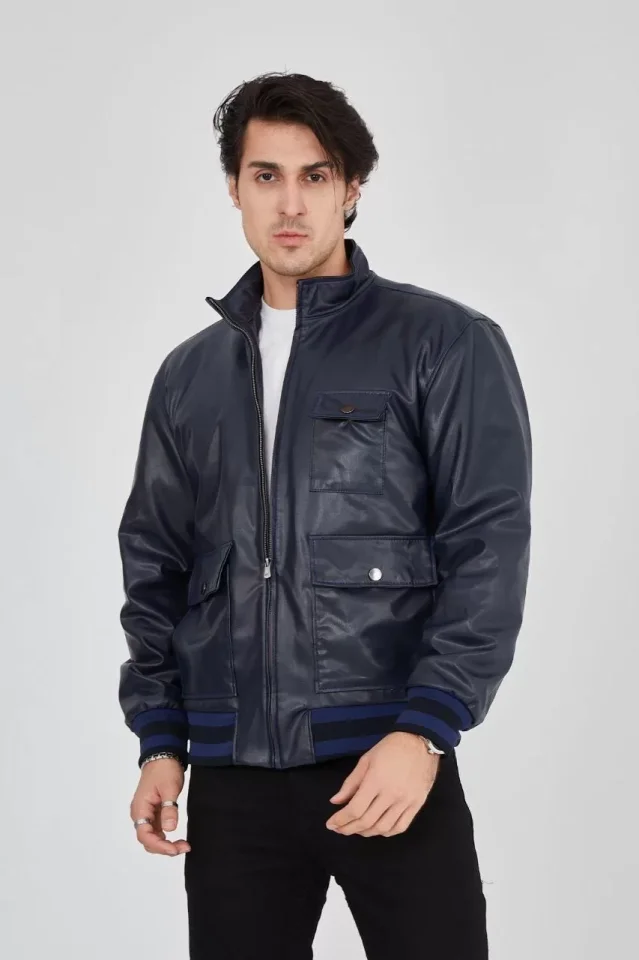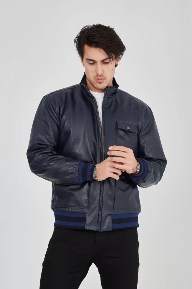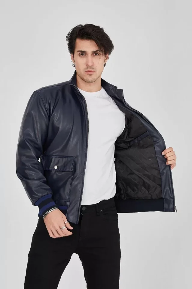 Erkek Fermuarlı İçten Elyaf Ve Astarlı Suni Deri Ceket – Lacivert