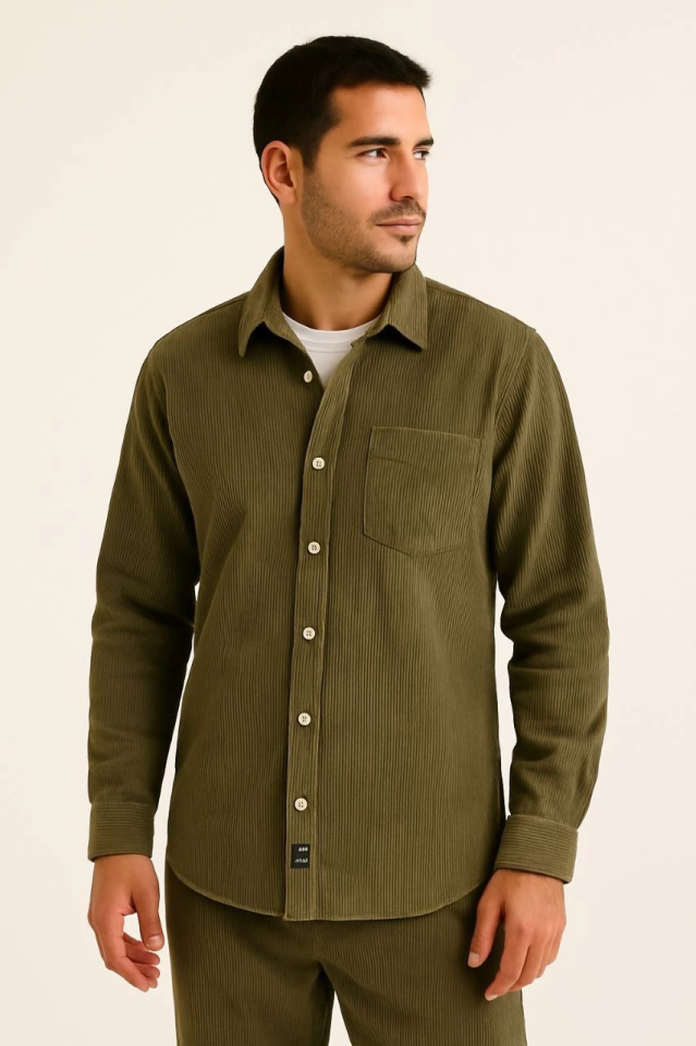 Erkek Fitilli Kadife Cepli Gömlek Oversize Rahat Kalıp – Haki