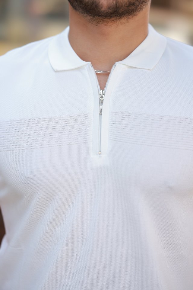 Erkek Göğüs Pirinç Desenli Fermuar Yakalı Kısa Kollu Tişört