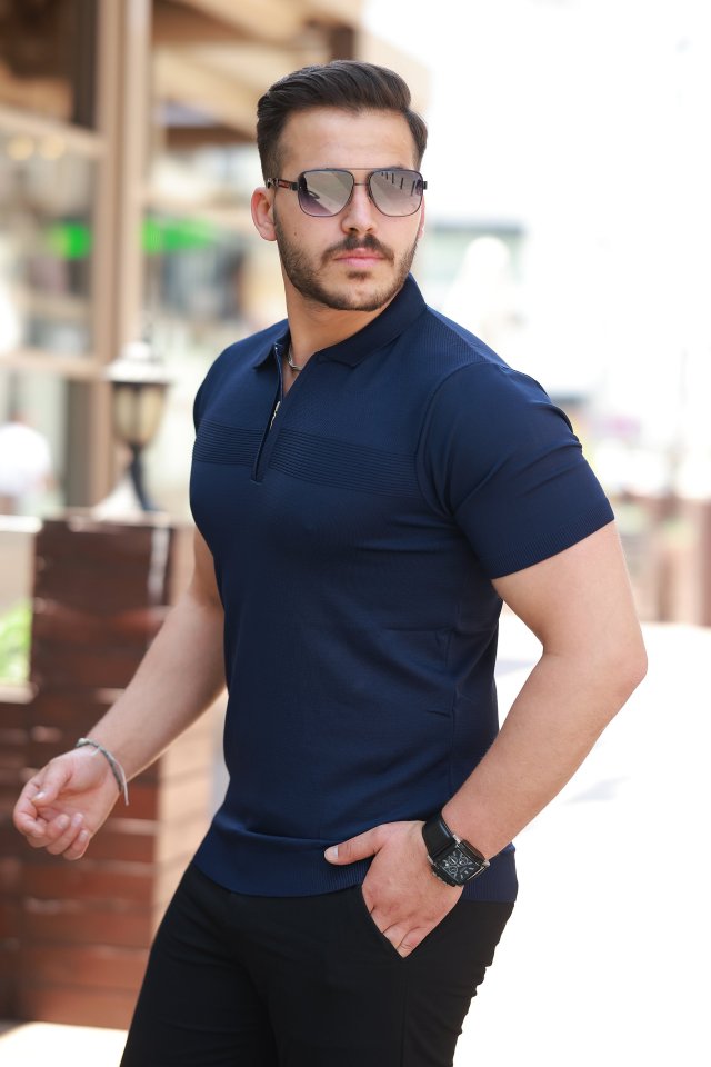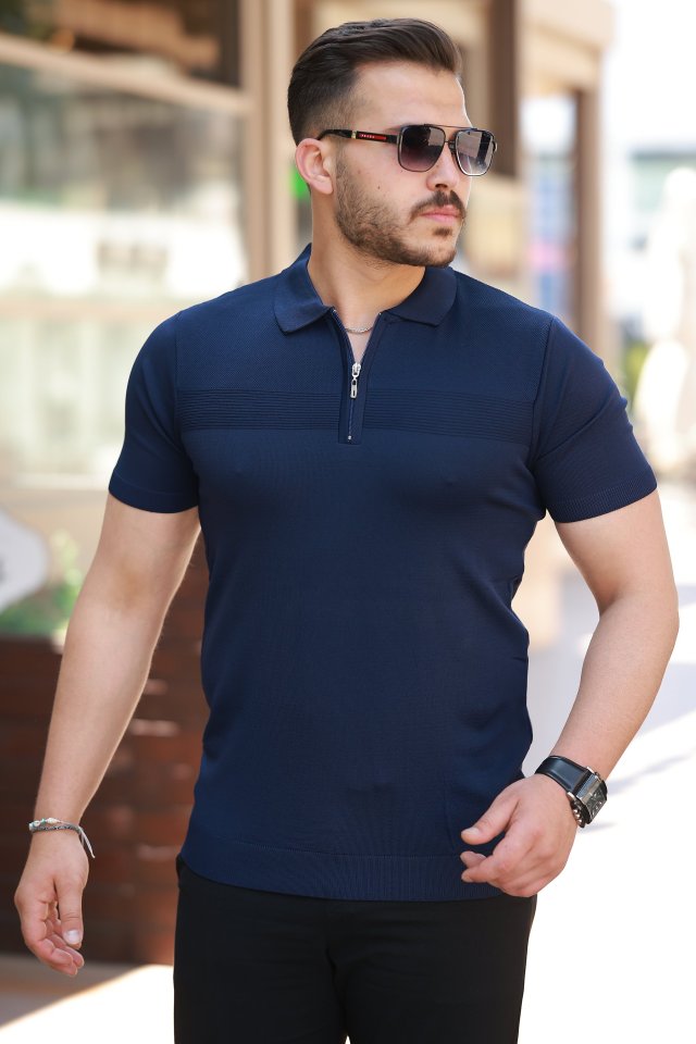 Erkek Göğüs Pirinç Desenli Fermuar Yakalı Kısa Kollu Tişört adet