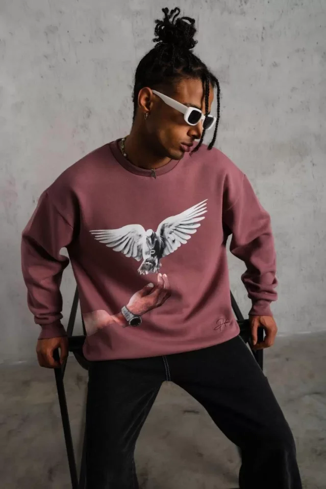 Erkek Güvercin Baskılı Sweatshirt – Gül Kurusu