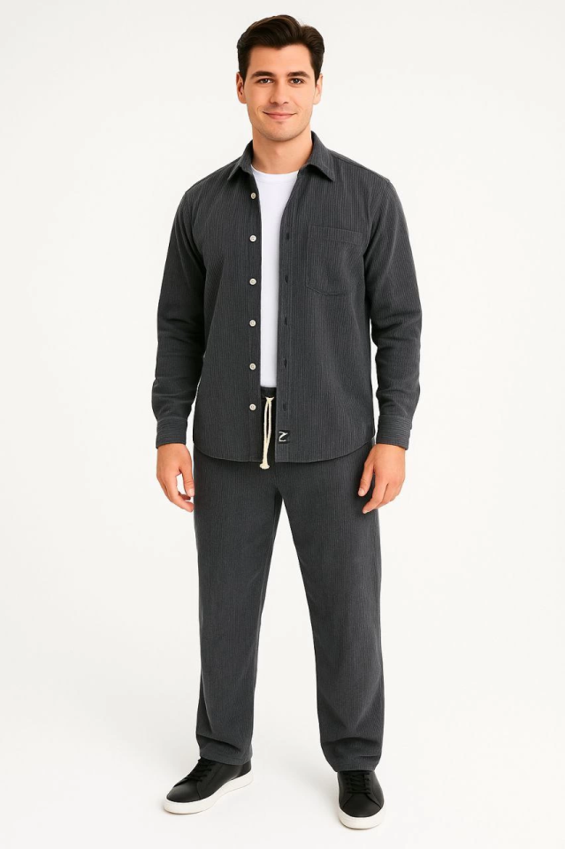 Erkek Kadife Oversize Takım – Gömlek Ve Pantolon İkili Set Füme Corduroy Şıklığı, Rahat Ve Zarif Duruş Yumuşak Dokulu Kadife Kumaş, Düğmeli Gömlek Üst Ve Lastikli Pantolon Alt Parça Ile Gün Boyu Konfor- Füme