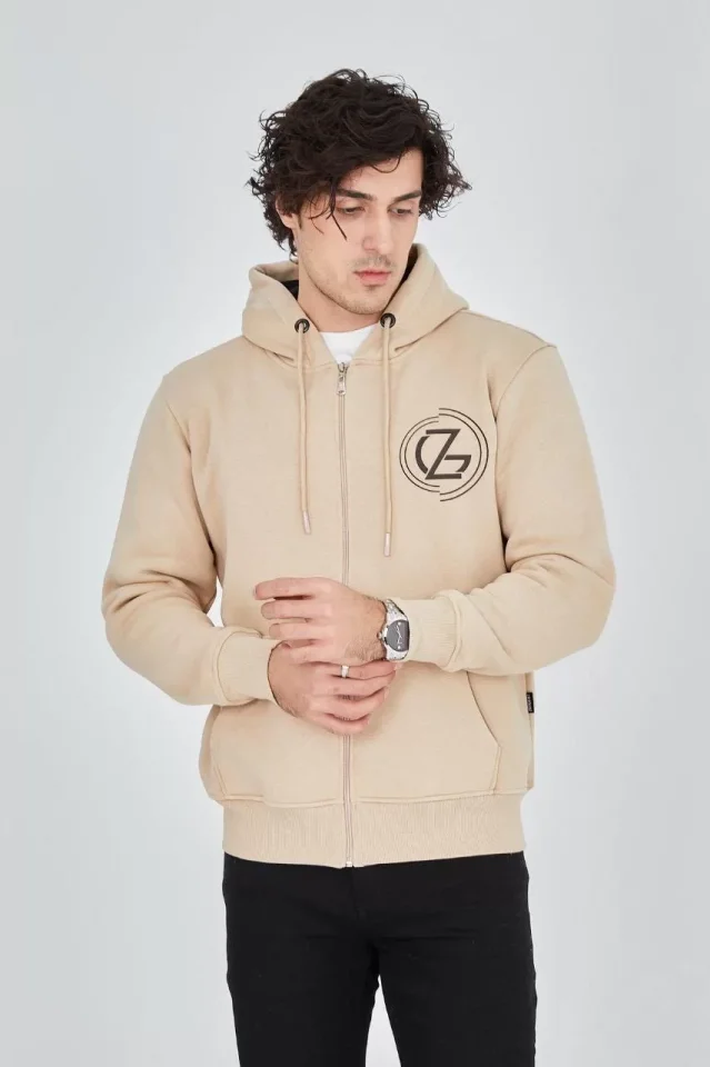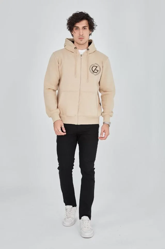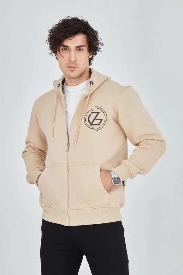 Erkek Kapüşonlu Baskılı Fermuarlı Hırka – Bej