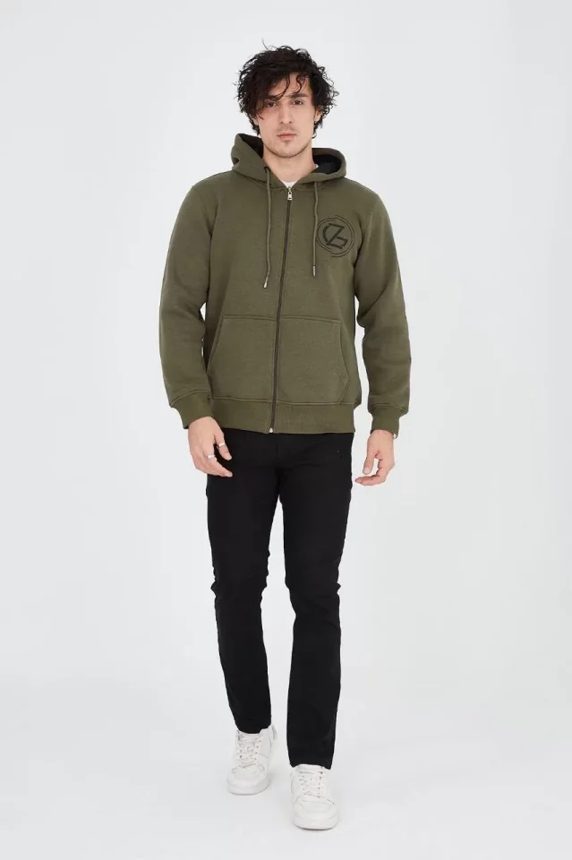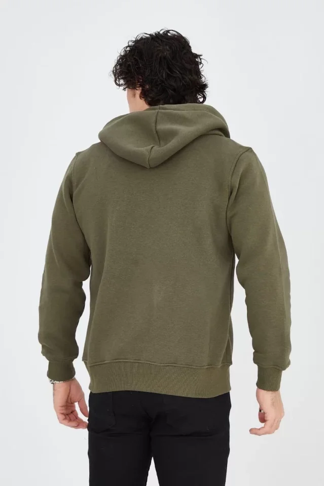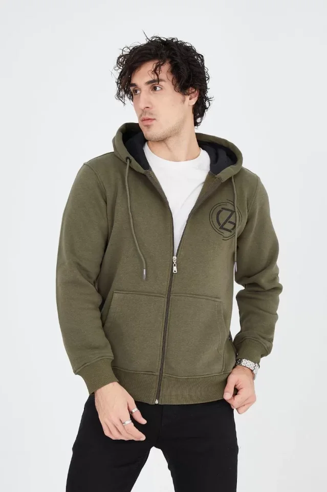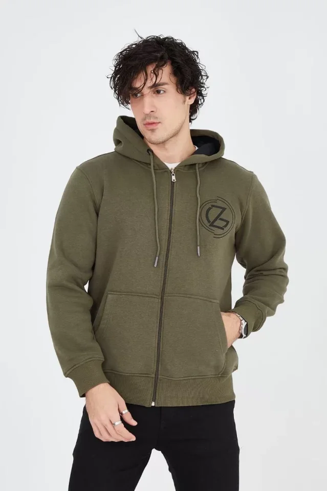 Erkek Kapüşonlu Baskılı Fermuarlı Hırka – Yeşil