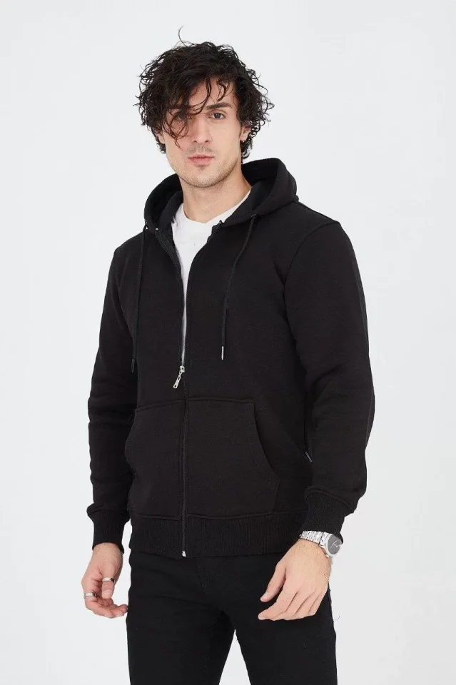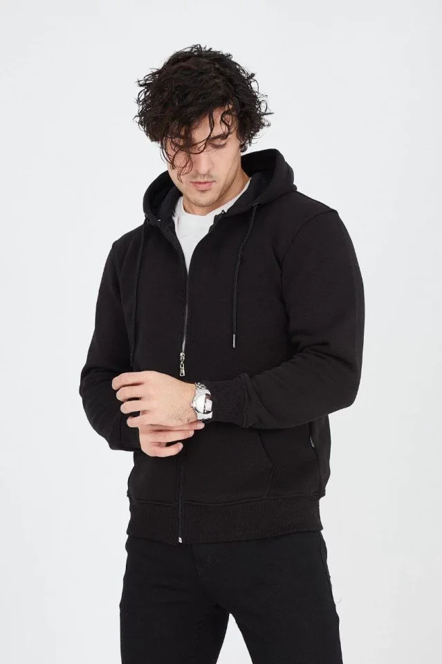 Erkek Kapüşonlu Düz Fermuarlı Hırka – Siyah